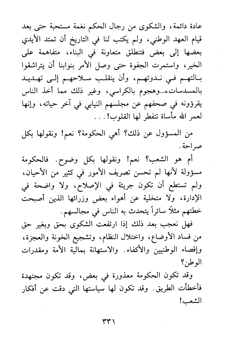 من المسؤول عن ذلك؟ أهي الحكومة؟ نعم! ونقولها بكل صراحة. أم هو الشعب؟ نعم! ونقولها بكل وضوح. فالحكومة مسؤولة لأنها لم تحسن تصريف الأمور في كثير من الأحيان، ولم تستطع أن تكون جريئة في الإصلاح، ولا واضحة في الإدارة، ولا متخلية عن أهواء بعض وزرائها الذين أصبحت خطتهم مثلاً سائراً يتحدث به الناس في مجالسهم. فهل نعجب بعد ذلك إذا ارتفعت الشكوى بحق وبغير حق من فساد الأوضاع، واختلال النظام، وتشجيع الخونة والعجزة، وإقصاء الوطنيين والأكفاء، والاستهانة بمالية الأمة ومقدرات الوطن؟ وقد تكون الحكومة معذورة في بعض، وقد تكون مجتهدة فأخطأت الطريق، وقد تكون لها سياستها التي دقت عن أفكار الشعب!