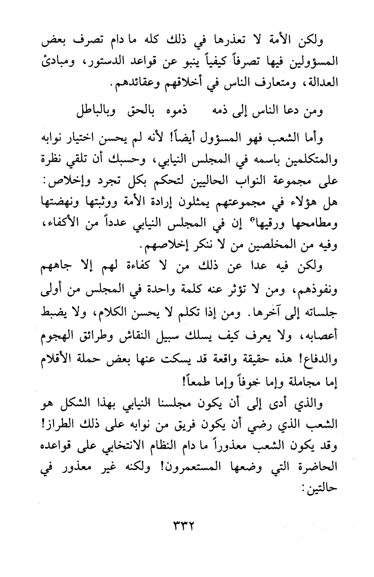ولكن الأمة لا تعذرها في ذلك كله ما دام تصرف بعض المسؤولين فيها تصرفاً كيفيًّا ينبو عن قواعد الدستور، ومبادئ العدالة، ومتعارف الناس في أخلاقهم وعقائدهم.