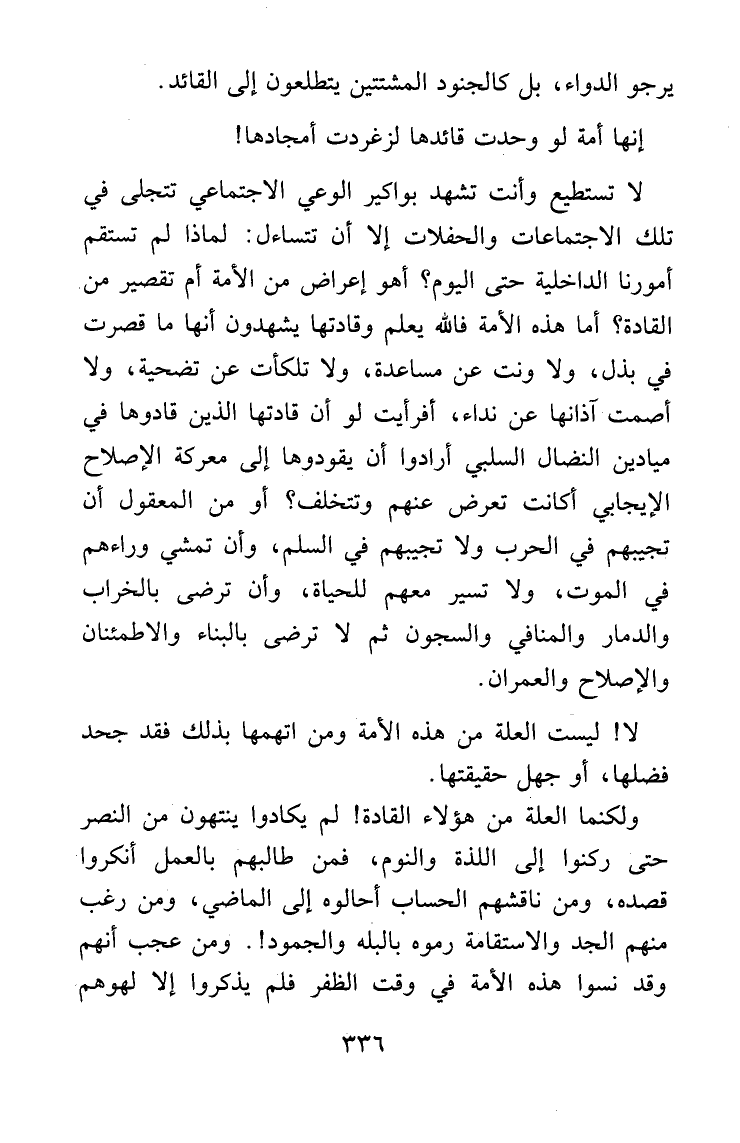 لا! ليست العلة من هذه الأمة ومن اتهمها بذلك فقد جحد فضلها، أو جهل حقيقتها، ولكنما العلة من هؤلاء القادة؛ لم يكادوا ينتهون من النصر حتى ركنوا إلى اللذة والنوم، فمن طالبهم بالعمل أنكروا قصده، ومن ناقشهم الحساب أحالوه إلى الماضي، ومن رغب منهم الجد والاستقامة رموه بالبله والجمود!. ومن عجبٍ أنهم وقد نسوا هذه الأمة في وقت الظفر فلم يذكروا إلا لهوهم