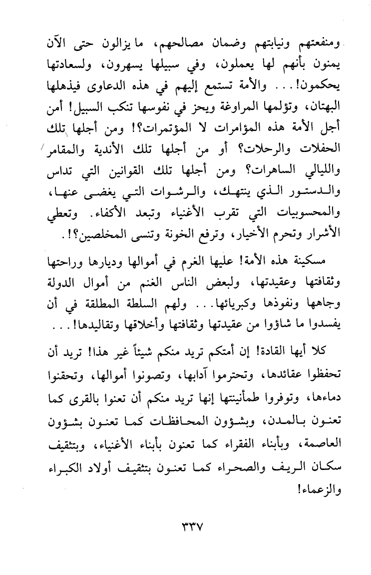 كلا أيها القادة! إن أمتكم تريد منكم شيئاً غير هذا؛ تريد أن تحفظوا عقائدها، وتحترموا آدابها، وتصونوا أموالها، وتحقنوا دماءها، وتوفروا طمأنينتها. إنها تريد منكم أن تعنوا بالقرى كما تعنون بالمدن، وبشؤون المحافظات كما تعنون بشؤون العاصمة، وبأبناء الفقراء كما تعنون بأبناء الأغنياء، وبتثقيف سكان الريف والصحراء كما تعنون بتثقيف أولاد الكبراء والزعماء!.