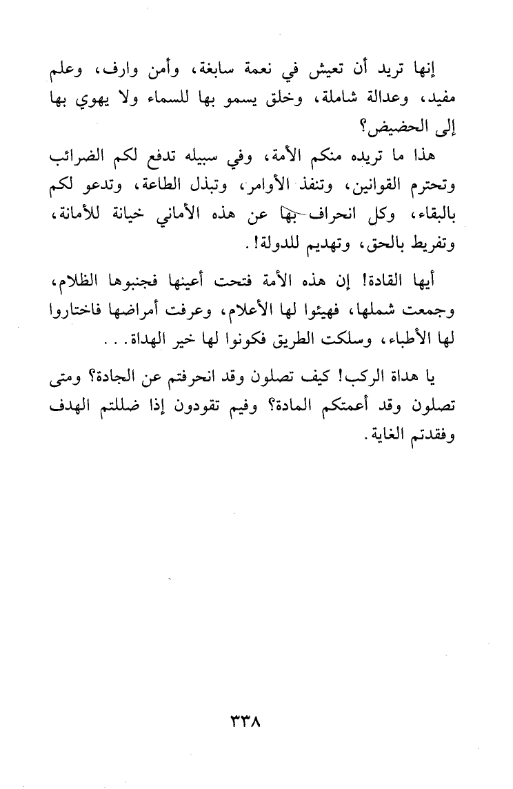 إنها تريد أن تعيش في نعمة سابغة، وأمن وارف، وعلم مفيد، وعدالة شاملة، وخلق يسمو بها للسماء ولا يهوي بها إلى الحضيض؟ هذا ما تريده منكم الأمة، وفي سبيله تدفع لكم الضرائب وتحترم القوانين، وتنفذ الأوامر، وتبذل الطاعة، وتدعو لكم بالبقاء، وكل انحراف بها عن هذه الأماني خيانة للأمانة، وتفريط بالحق، وتهديم للدولة!.