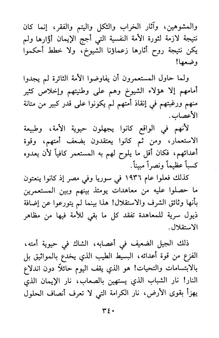 ولما حاول المستعمرون أن يفاوضوا الأمة الثائرة لم يجدوا أمامهم إلا هؤلاء الشيوخ وهم على وطنيتهم وإخلاص كثير منهم ورغبتهم في إنقاذ أمتهم، لم يكونوا على قدر كبير من متانة الأعصاب، لأنهم في الواقع كانوا يجهلون حيوية الأمة، وطبيعة الاستعمار، ومن ثم كانوا يعتقدون بضعف أمتهم، وقوة أعدائهم، فكان أقل ما يلوح لهم به المستعمر كافياً لأن يعدوه كسباً عظيماً ونصراً مبيناً. كذلك فعلوا عام 1936 في سوريا وفي مصر؛ إذ كانوا ينعتون ما حصلوا عليه من معاهدات يومئذ بينهم وبين المستعمرين بأنها وثائق الشرف والاستقلال! هذا بينما لم يتورعوا عن إضافة ذيول سريعة للمعاهدة تُفقد كل ما بقي للأمة فيها من مظاهر الاستقلال.