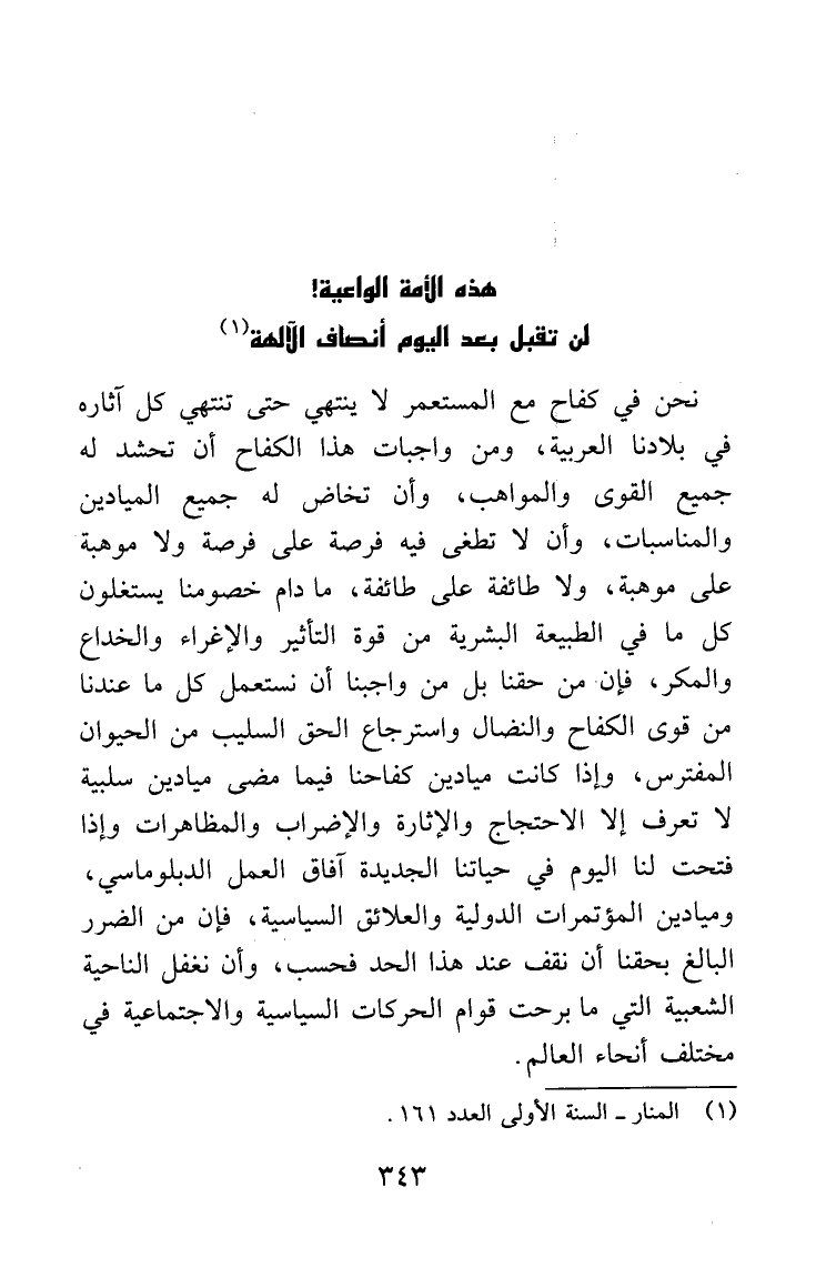 نحن في كفاح مع المستعمر لا ينتهي حتى تنتهي كل آثاره في بلادنا العربية، ومن واجبات هذا الكفاح: أن تحشد له جميع القوى والمواهب، وأن تخاض له جميع الميادين والمناسبات، وأن لا تطغى فيه فرصة على فرصة ولا موهبة على موهبة، ولا طائفة على طائفة، ما دام خصومنا يستغلون كل ما في الطبيعة البشرية من قوة التأثير والإغراء والخداع والمكر؛ فإن من حقنا بل من واجبنا أن نستعمل كل ما عندنا من قوى الكفاح والنضال واسترجاع الحق السليب من الحيوان المفترس، وإذا كانت ميادين كفاحنا فيما مضى ميادين سلبية لا تعرف إلا الاحتجاج والإثارة والإضراب والمظاهرات، وإذا فتحت لنا اليوم في حياتنا الجديدة آفاق العمل الديبلوماسي، وميادين المؤتمرات الدولية والعلائق السياسية، فإن من الضرر البالغ بحقنا أن نقف عند هذا الحد فحسب، وأن نغفل الناحية الشعبية التي ما برحت قوام الحركات السياسية والاجتماعية في مختلف أنحاء العالم.