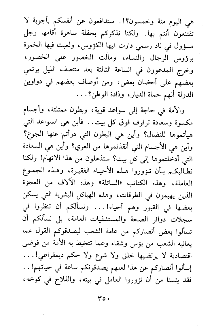 هي اليوم مائة وخمسون؟!. ستدافعون عن أنفسكم بأجوبة لا تقتنعون أنتم بها .. ولكننا نذكركم بحفلة ساهرة أقامها رجل مسؤول في ناد رسمي دارت فيها الكؤوس، ولعبت فيها الخمرة برؤوس الرجال والنساء، ومالت الخصور على الخصور، وخرج المدعوون في الساعة الثالثة بعد منتصف الليل يرتمي بعضهم على أحضان بعض، ومن أوصاف بعضهم في دواوين الدولة أنهم حماة الديار، وذادة الوطن؟.