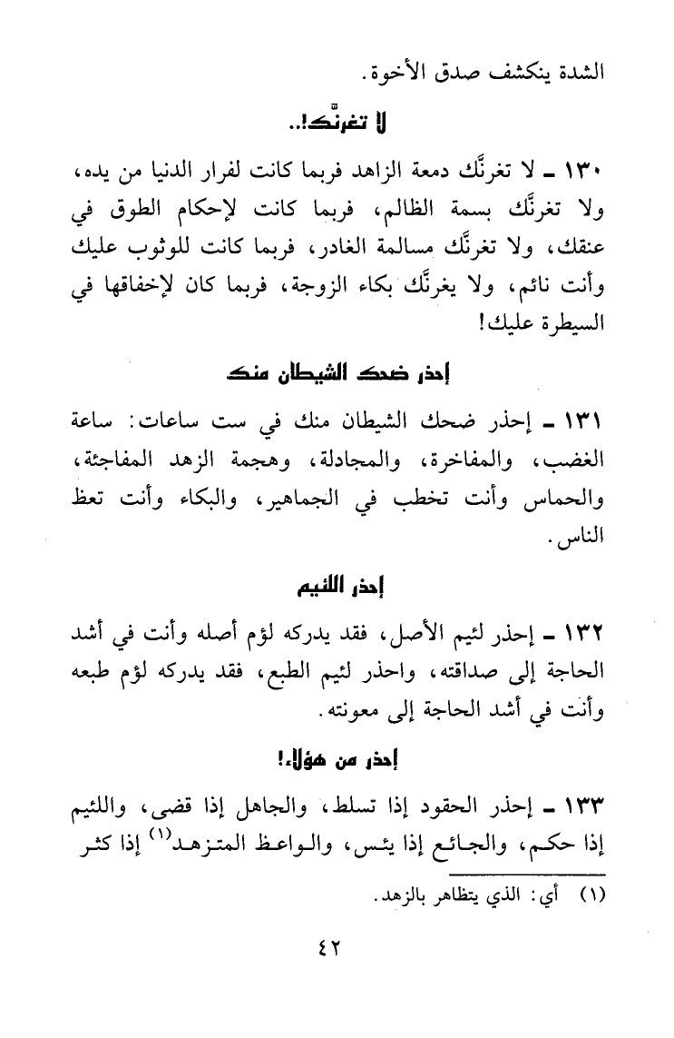 لا تغرنك دمعة الزاهد فربما كانت لفرار الدنيا من يده، ولا تغرنك بسمة الظالم، فربما كانت لإحكام الطوق في عنقك، ولا تغرنك مسالمة الغادر، فربما كانت للوثوب عليك وأنت نائم، ولا يغرنك بكاء الزوجة، فربما كان لإخفاقها في السيطرة عليك!.