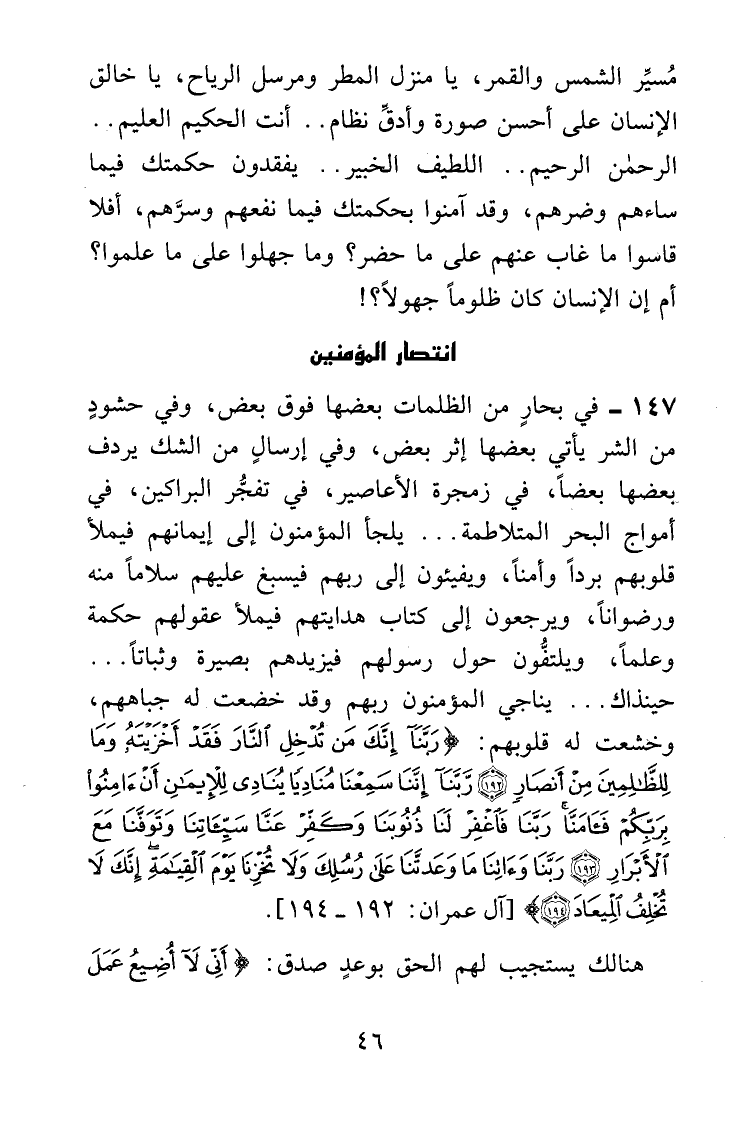 مسير الشمس والقمر، يا منزل المطر ومرسل الرياح، يا خالق الإنسان على أحسن صورة وأدقّ نظام .. أنت الحكيم العليم .. الرحمن الرحيم .. اللطيف الخبير .. يفقدون حكمتك فيما ساءهم وضرهم، وقد آمنوا بحكمتك فيما نفعهم وسرّهم، أفلا قاسوا ما غاب عنهم على ما حضر؟ وما جهلوا على ما علموا؟ أم أن الإنسان كان ظلوماً جهولاً؟!