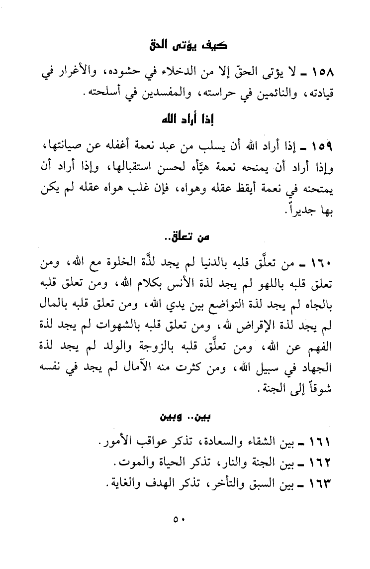 من تعلَّق قلبه بالدنيا لم يجد لذَّة الخلوة مع الله، ومن تعلق قلبه باللهو لم يجد لذة الأنس بكلام الله، ومن تعلق قلبه بالجاه لم يجد لذة التواضع بين يدي الله، ومن تعلق قلبه بالمال لم يجد لذة الإقراض لله، ومن تعلق قلبه بالشهوات لم يجد لذة الفهم عن الله، ومن تعلق قلبه بالزوجة والولد لم يجد لذة الجهاد في سبيل الله، ومن كثرت منه الآمال لم يجد في نفسه شوقاً إلى الجنة.
