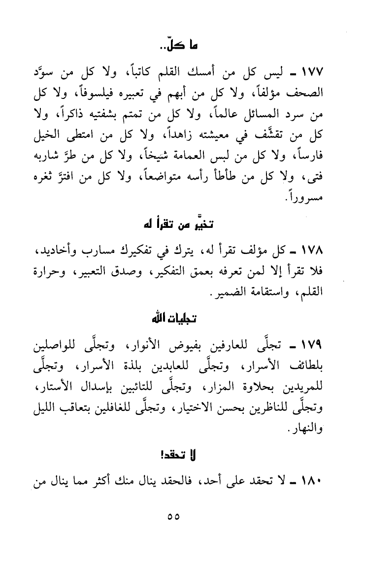 ليس كل من أمسك القلم كاتباً، ولا كل من سوَّد الصحف مؤلفاً، ولا كل من أبهم في تعبيره فيلسوفاً، ولا كل من سرد المسائل عالماً، ولا كل من تمتم بشفتيه ذاكراً، ولا كل من تقشَّف في معيشته زاهداً، ولا كل من امتطى الخيل فارساً، ولا كل من لاث العمامة شيخاً، ولا كل من طرّ شاربه فتى، ولا كل من طأطأ رأسه متواضعاً، ولا كل من افترَّ ثغره مسروراً.