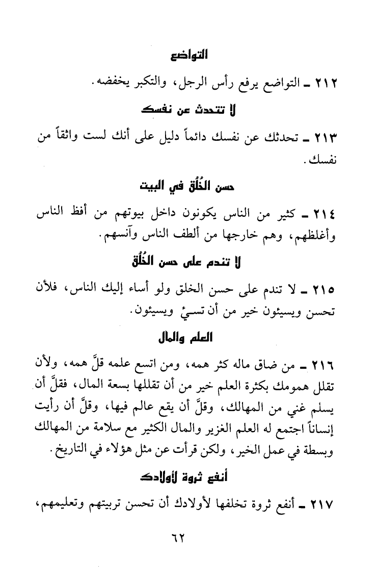 من ضاق ماله كثر همه، ومن اتسع علمه قلّ همه، ولأن تقلل همومك بكثرة العلم خير من أن تقللها بسعة المال، فقلَّ أن يسلم غني من المهالك، وقلَّ أن يقع عالم فيها، وقلَّ أن رأيت إنساناً اجتمع له العلم الغزير والمال الكثير مع سلامة من المهالك وبسطة في عمل الخير، ولكن قرأت عن مثل هؤلاء في التاريخ.