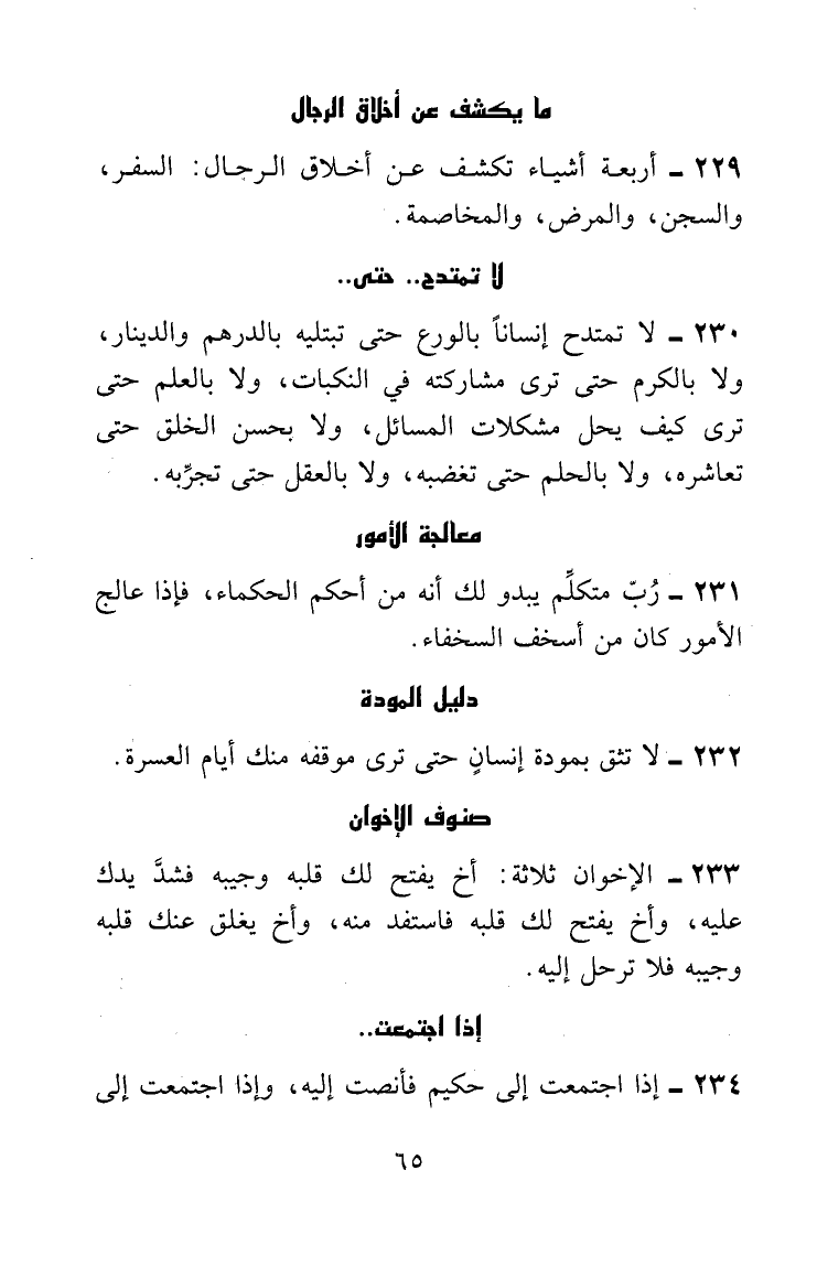 لا تمتدح إنساناً بالورع حتى تبتليه بالدرهم والدينار، ولا بالكرم حتى ترى مشاركته في النكبات، ولا بالعلم حتى ترى كيف يحل مشكلات المسائل، ولا بحسن الخلق حتى تعاشره، ولا بالحلم حتى تغضبه، ولا بالعقل حتى تجربه.