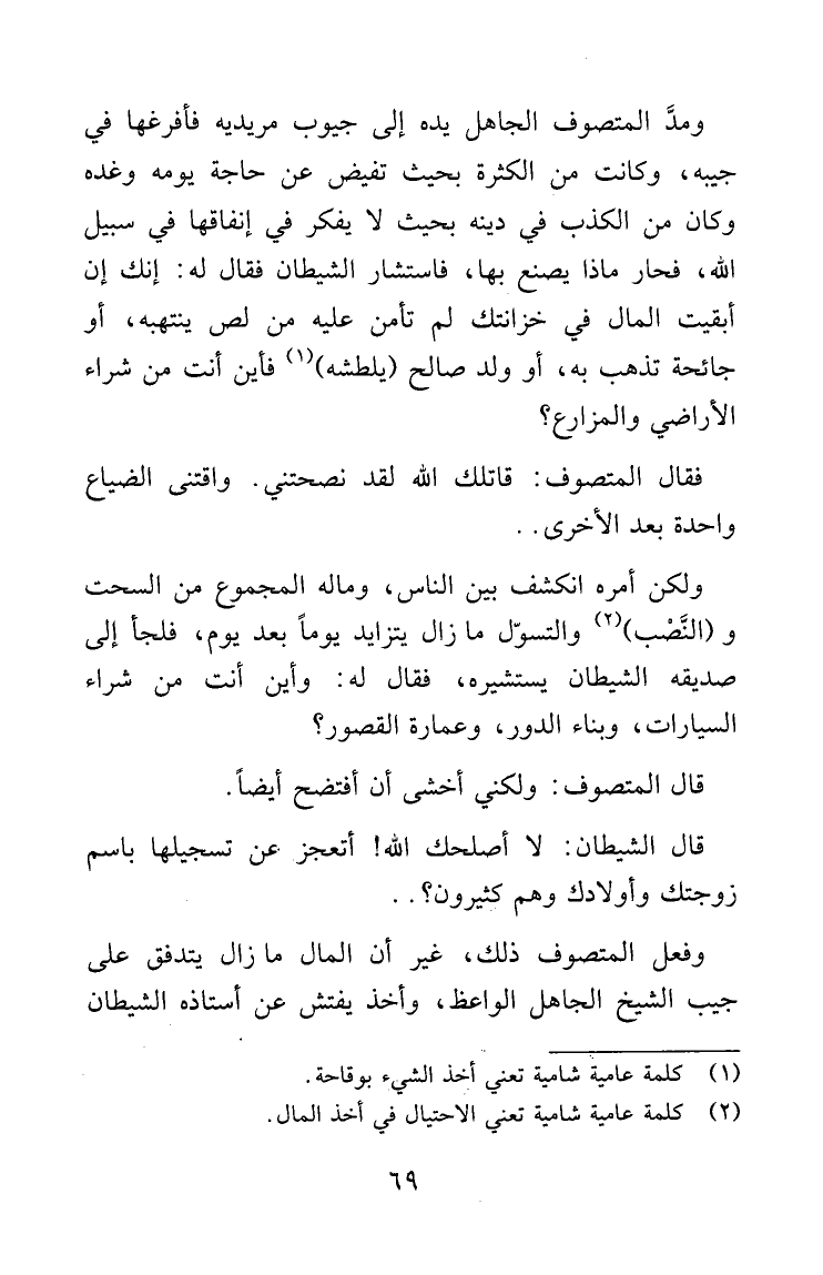 ومدّ المتصوف الجاهل يده إلى جيوب مريديه فأفرغها في جيبه، وكانت من الكثرة بحيث تفيض عن حاجة يومه وغده وكان من الكذب في دينه بحيث لا يفكر في إنفاقها في سبيل الله، فحار ماذا يصنع بها، فاستشار الشيطان فقال له: إنك إن أبقيت المال في خزانتك لم تأمن عليه من لص ينتهبه، أو جائحة تذهب به، أو ولد صالح يلطشه (كلمة عامية شامية تعني أخذ الشيء بوقاحة) فأين أنت من شراء الأراضي والمزارع؟