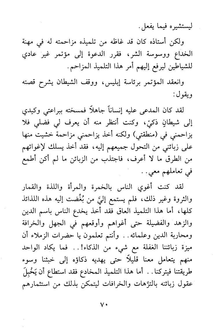 لقد كنت أغوي الناس بالخمرة والمرأة واللذة والقمار والثروة وغير ذلك، فلم يستمع إليَّ من بغِّضت إليه هذه اللذائذ كلها، أما هذا التلميذ العاق فقد أخذ يخدع الناس باسم الدين والزهد والفضيلة حتى أغواهم وأوقعهم في الجهل والخرافة ومحاربة الدين وعلمائه .. وأنتم تعلمون يا حضرات الزملاء أن ميزة زبائننا، الغفلة مع شيء من الذكاء! .. فما يكاد الواحد منهم يتعامل معنا قليلاً حتى يهديه ذكاؤه إلى خبثنا وسوء طريقتنا فيتركنا .. أما هذا التلميذ المخادع فقد استطاع أن يخبل عقول زبائنه بالترَّهات والخرافات ليتمكن بذلك من استثمارهم