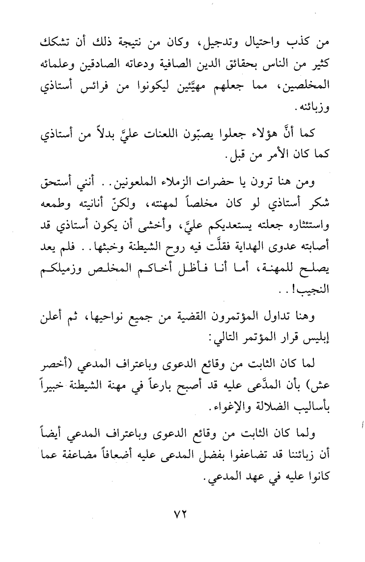 لما كان الثابت من وقائع الدعوى وباعتراف المدعي (أخصر عش) بأن المدّعى عليه قد أصبح بارعاً في مهنة الشيطنة خبيراً بأساليب الضلالة والإغواء.