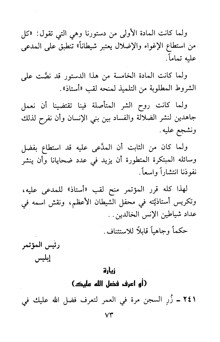 لهذا كله قرر المؤتمر منح لقب "أستاذ" للمدعى عليه، وتكريس أستاذيَّته في محفل الشيطان الأعظم، ونقش اسمه في عداد شياطين الإنس الخالدين ..