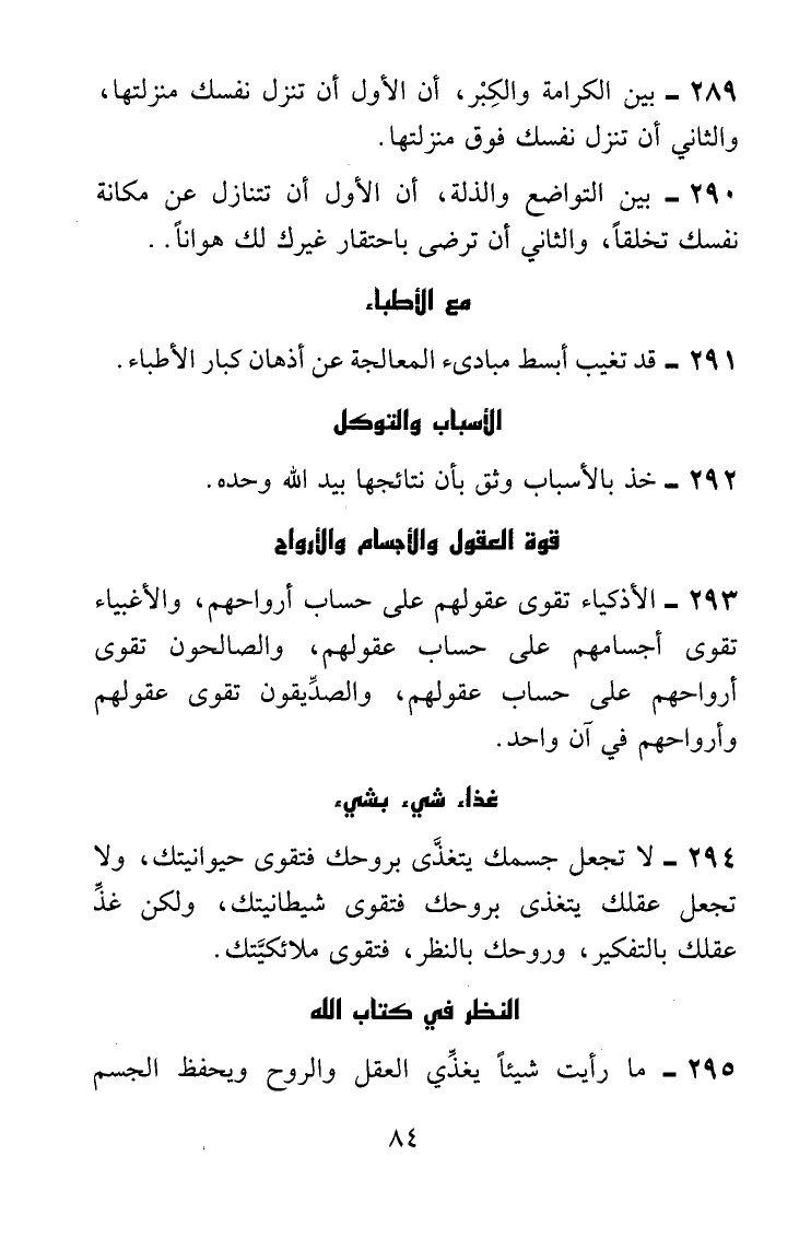 لا تجعل جسمك يتغذَّى بروحك فتقوى حيوانيتك، ولا تجعل عقلك يتغذى بروحك فتقوى شيطانيتك، ولكن غذِّ عقلك بالتفكير، وروحك بالنظر، فتقوى ملا ئكيَّتك.