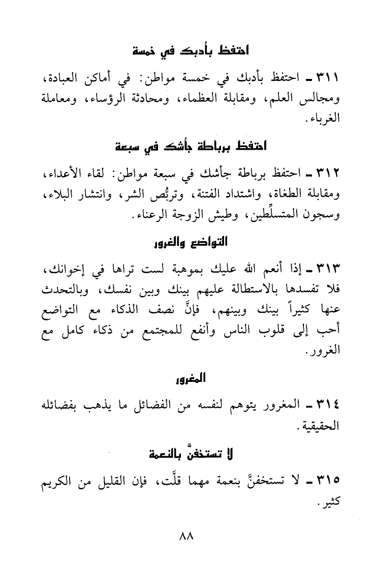 احتفظ بأدبك في خمسة مواطن: في أماكن العبادة، ومجالس العلم، ومقابلة العظماء، ومحادثة الرؤساء، ومعاملة الغرباء.