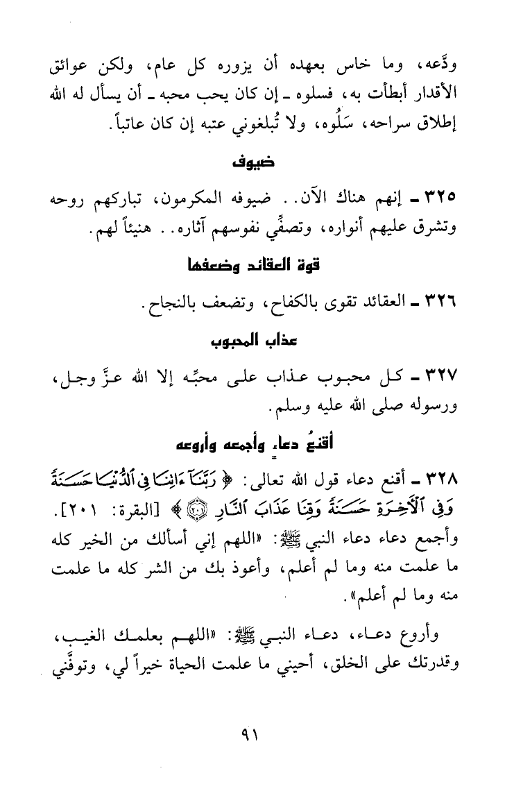 أقنع دعاء قول الله تعالى: {ربنا ءاتنا في الدنيا حسنة وفي الآخرة حسنة وقنا عذاب النار} وأجمع دعاء، دعاء النبي صلى الله عليه وسلم: "اللهم إني أسألك من الخير كله ما علمت منه وما لم أعلم، وأعوذ بك من الشر كله ما علمت منه وما لم أعلم".