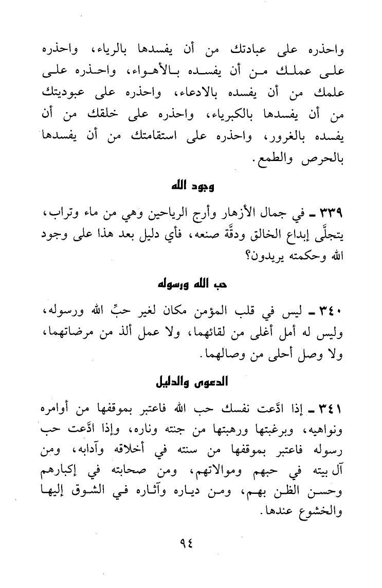 واحذره على عبادتك من أن يفسدها بالرياء، واحذره على عملك من أن يفسده بالأهواء، واحذره على علمك من أن يفسده بالادِّعاء، واحذره على عبوديتك من أن يفسدها بالكبرياء، واحذره على خلقك من أن يفسده بالغرور، واحذره عن استقامتك من أن يفسدها بالحرص والطمع.