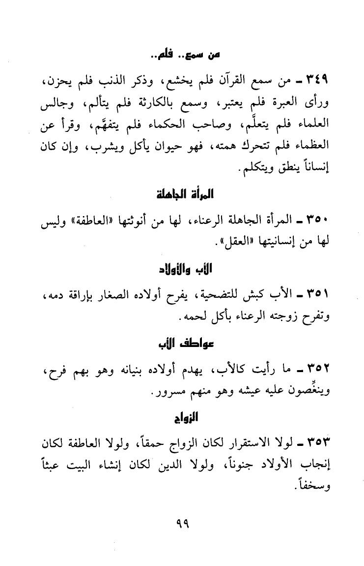 المرأة الجاهلة الرعناء، لها من أنوثتها "العاطفة"، وليس لها من إنسانيتها "العقل".