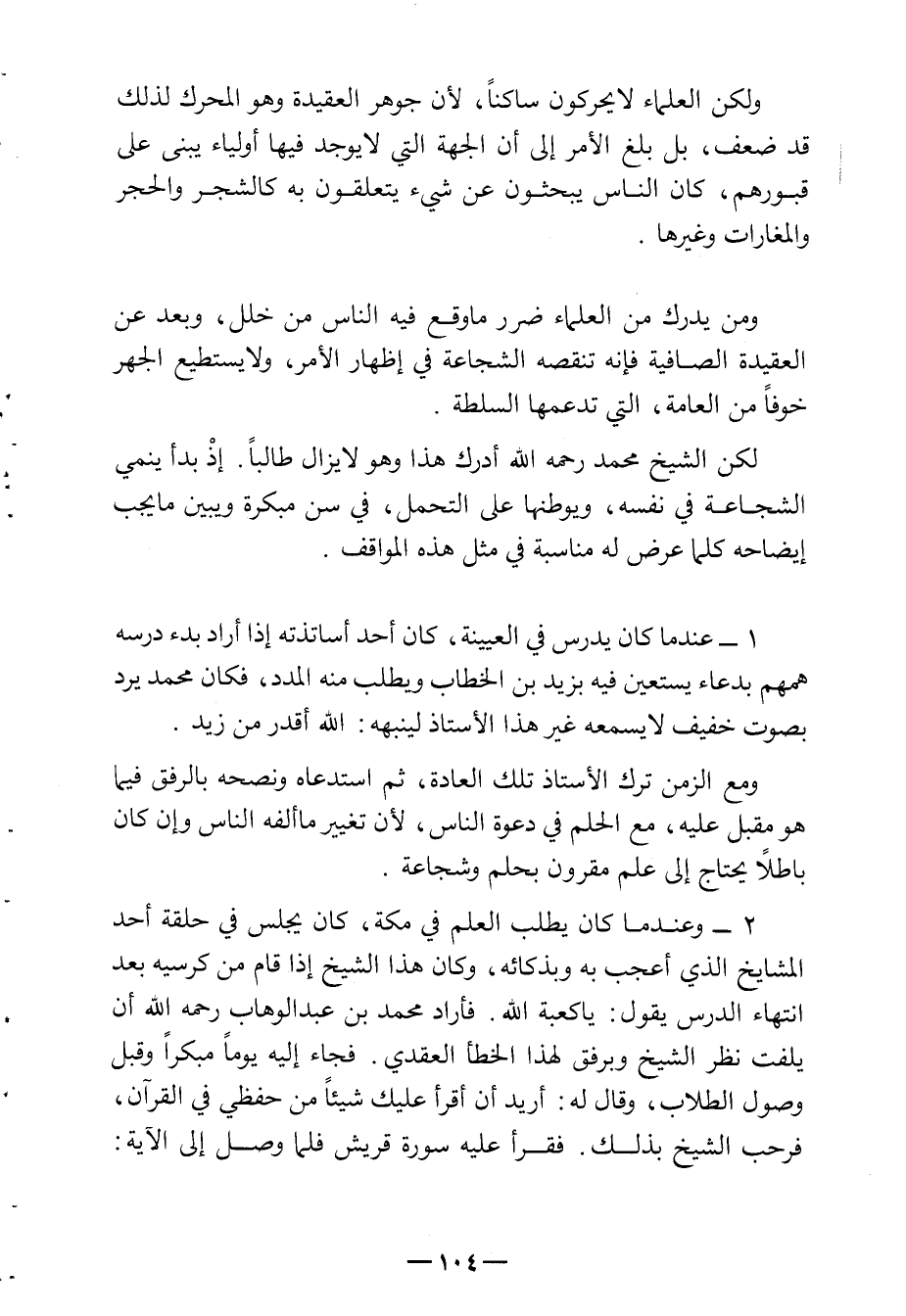 2- وعندما كان يطلب العلم في مكة كان يجلس في حلقة أحد المشايخ الذي أعجب به وبذكائه وكان هذا الشيخ إذا قام من كرسيه بعد انتهاء الدرس يقول: يا كعبة الله. فأراد محمد بن عبد الوهاب رحمه الله أن يلفت نظر الشيخ وبرفق لهذا الخطأ العقدي. فجاء إليه يوماً مبكراً وقبل وصول الطلاب وقال له: أريد أن أقرأ عليك شيئاً من حفظي في القرآن فرحب الشيخ بذلك: فقرأ عليه سورة قريش فلما وصل إلى الآية: