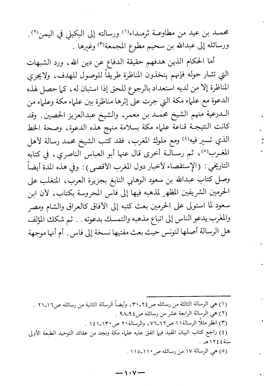 أما الحكام الذين هدفهم حقيقة الدفاع عن دين الله ورد الشبهات التي تثار حوله فإنهم يتخذون المناظرة طريقاً للوصول للهدف ولا يجري المناظرة إلا من لديه استعداد بالرجوع للحق إذا استبان له كما حصل لهذه الدعوة مع علماء مكة التي جرت على إثرها مناظرة بين علماء مكة وعلماء من الدرعية منهم الشيخ محمد بن معمر , والشيخ عبد العزيز الحصين. وقد كانت النتيجة قناعة علماء مكة بسلامة منهج هذه الدعوة وصحة الخط الذي تسير فيه (¬4) ومع ملوك المغرب فقد كتب الشيخ محمد رسالة لأهل المغرب (¬5) ثم رسالة أخرى قال عنها أبو العباس الناصري في كتابه التاريخي " الاستقصاء لأخبار دول المغرب الأقصى " وفي هذه المدة أيضاً وصل كتاب عبد الله بن سعود الوهابي النابغ بجزيرة العرب , المتغلب على الحرمين الشريفين المظهر لمذهبه فيها إلى فاس المحروسة بكتاب لأن ابن سعود لما استولى على الحرمين بعث كتبه إلى الآفاق كالعراق والشام ومصر والمغرب يدعوا الناس إلى اتباع مذهبه والتمسك بدعوته ... ثم شكك المؤلف هل الرسالة أصلها لتونس حيث بعث مفتيها نسخة إلى فاس. أم أنها موجهة