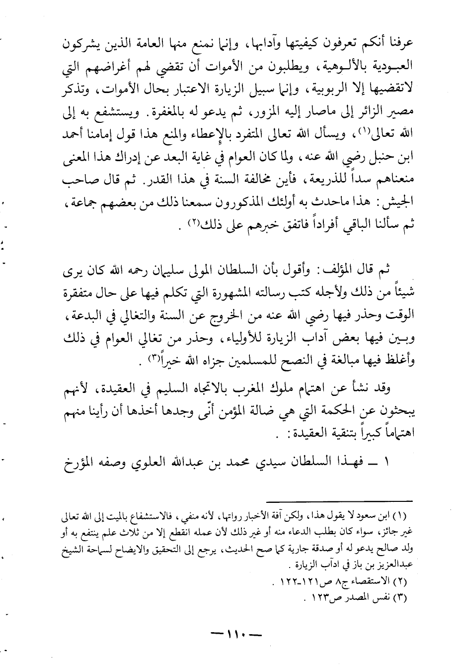 ثم قال المؤلف: وأقول بأن السلطان المولى سليمان رحمه الله كان يرى شيئاً من ذلك ولأجله كتب رسالته المشهورة التي تكلم فيها على حال متفقرة الوقت وحذر فيها رضي الله عنه من الخروج عن السنة وتغالي العوام في ذلك وأغلظ فيها مبالغة في النصح للمسلمين جزاه الله خيراً (¬3)