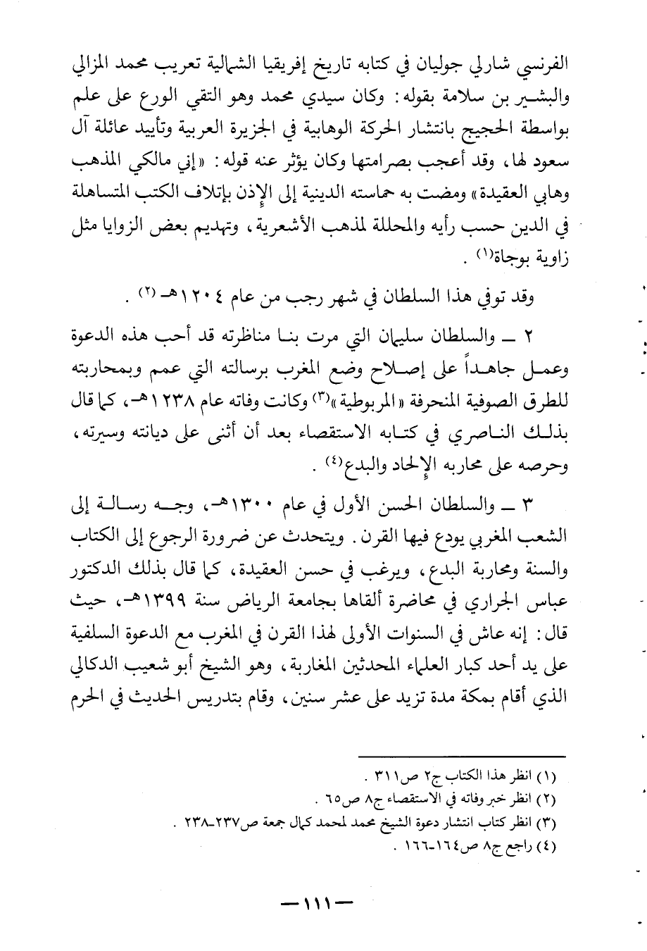 2- والسلطان سليمان التي مرت بنا مناظرته قد أحب هذه الدعوة وعمل جاهداً على إصلاح وضع المغرب برسالته التي عمم وبمحاربته للطرق الصوفية المنحرفة " المربوطية (¬3) وكانت وفاته عام 1238 هـ كما قال بذلك الناصري في كتابه الاستقصاء بعد أن أثنى على ديانته وسيرته وحرصه على محاربة الإلحاد والبدع (¬4) .