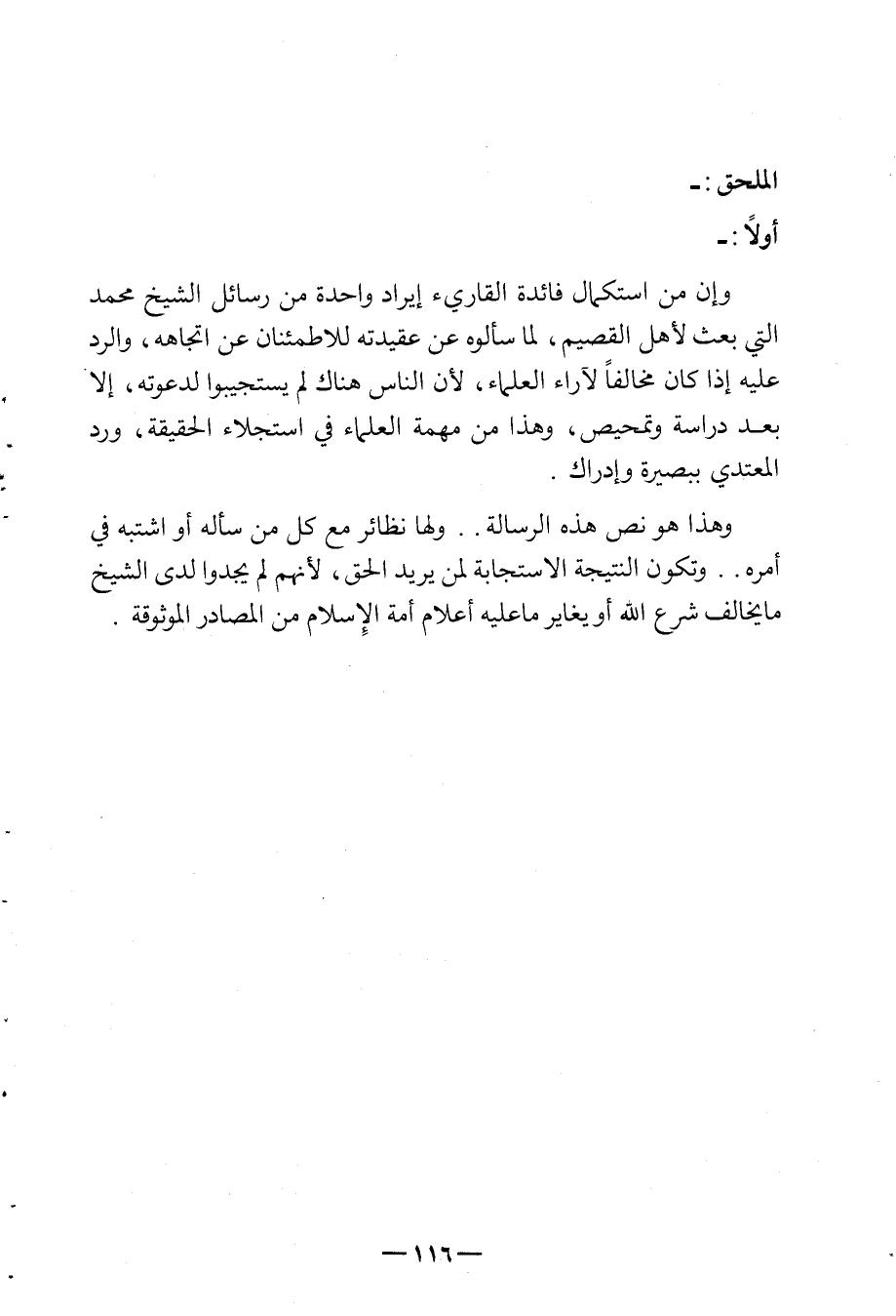 وإن من استكمال فائدة القارئ إيراد واحدة من رسائل الشيخ محمد التي بعث لأهل القصيم لما سألوه عن عقيدته للاطمئنان عن اتجاهه والرد عليه إذا كان مخالفاً لآراء العلماء لأن الناس هناك لم يستجيبوا لدعوته إلا بعد دراسة وتمحيص وهذا من مهمة العلماء في استجلاء الحقيقة ورد المعتدي ببصيرة وإدراك.