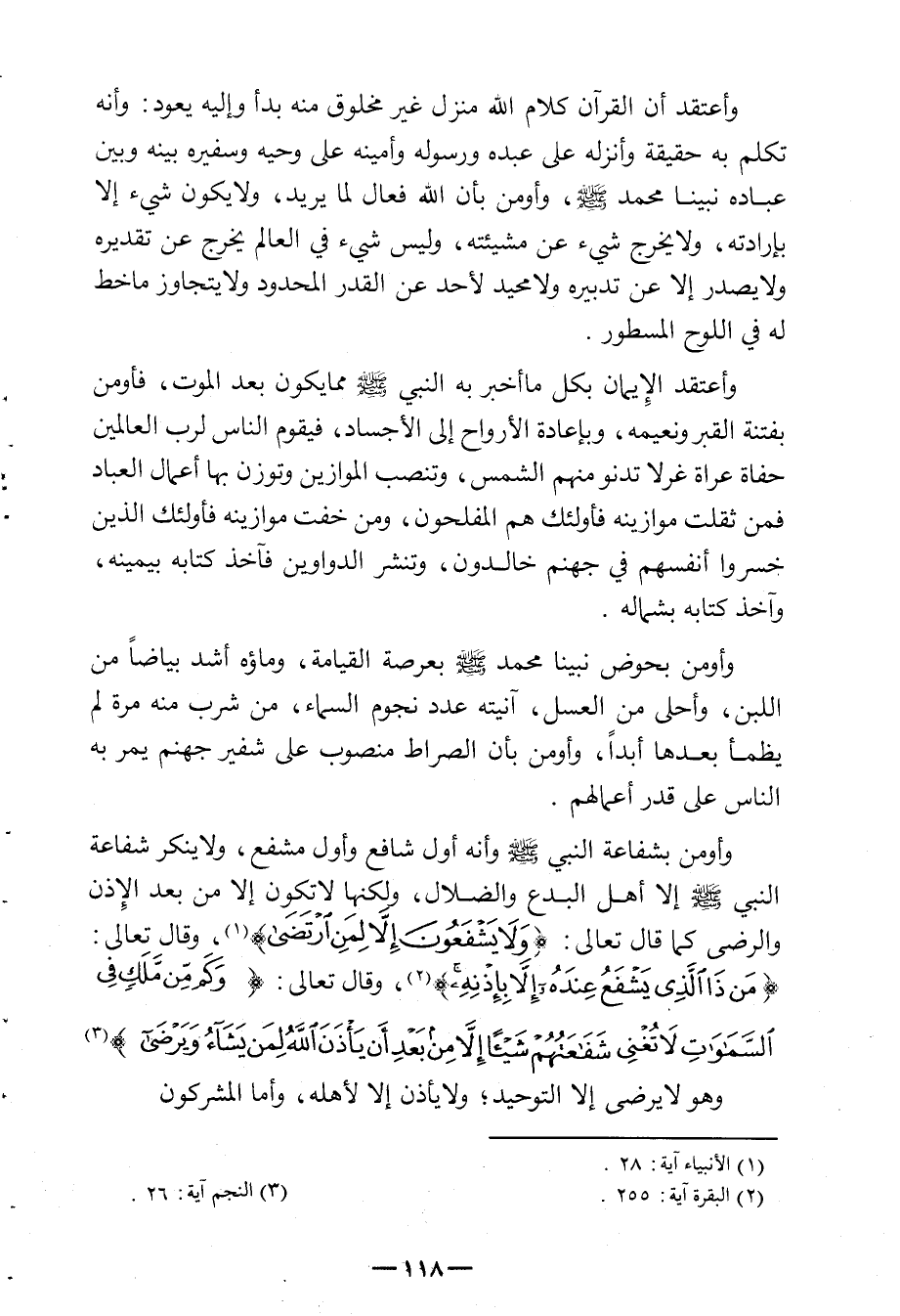 وأعتقد أن القرآن كلام الله منزل غير مخلوق منه بدأ إليه ويعود: وأنه تكلم به حقيقة وأنزله على عبده ورسوله وأمينه على وحيه وسفيره بينه وبين عباده نبينا محمد صلى الله عليه وسلم وأومن بأن الله فعال لما يريد ولا يكون شئ إلا بإرادته ولا يخرج شئ عن مشيئته وليس شئ في العالم يخرج عن تقديره ولا يصدر إلا عن تدبيره ولا محيد لأحد عن القدر المحدود ولا يتجاوز ما خط له في اللوح المسطور.