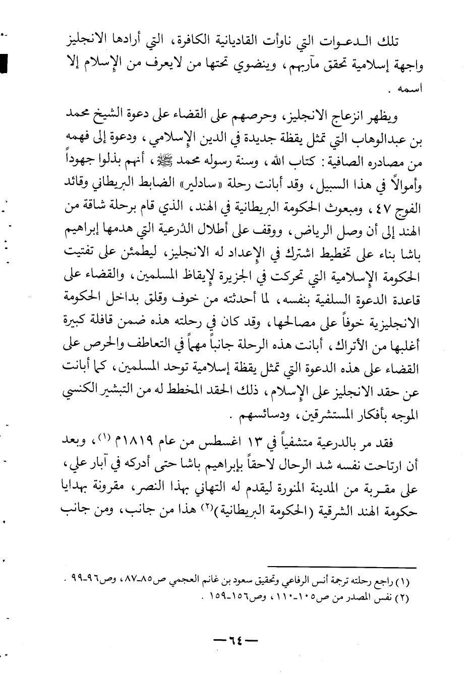 ويظهر انزعاج الإنجليز وحرصهم على القضاء على دعوة الشيخ محمد بن عبد الوهاب التي تمثل يقظة جديدة في الدين الإسلامي ودعوة إلى فهمه من مصادر الصافية: كتاب الله , وسنة رسوله محمد صلى الله عليه وسلم، أنهم بذلوا جهوداً وأموالاً في هذا السبيل وقد أبانت رحلة " سادلير" الضابط البريطاني وقائد الفوج 47 ومبعوث الحكومة البريطانية في الهند الذي قام برحلة شاقة من الهند إلى أن وصل الرياض ووقف على أطلال الدرعية التي هدمها إبراهيم باشا بناء على تخطيط اشترك في الإعداد له الإنجليز ليطمئن على تفتيت الحكومة الإسلامية التي تحركت في الجزيرة لإيقاظ المسلمين والقضاء على قاعدة الدعوة السلفية بنفسه لما أحدثته من خوف وقلق بداخل الحكومة الإنجليزية خوفاً على مصالحها وقد كان في رحلته هذه ضمن قافلة كبيرة أغلبها من الأتراك أبانت هذه الرحلة جانباً مهماً في التعاطف والحرص على القضاء على هذه الدعوة التي تمثل يقظة إسلامية توحد المسلمين كما أبانت عن حقد الإنجليز على الإسلام ذلك الحقد المخطط له من التبشير الكنسي الموجه بأفكار المستشرقين ودسائسهم.