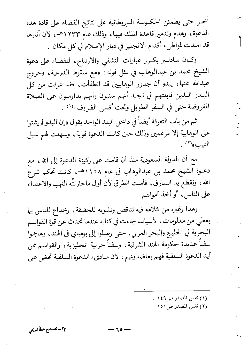 وهذا وغيره من كلامه فيه تناقض وتشويه للحقيقة وخداع للناس بما يعطي من معلومات لأسباب جاءت في كتابه عندما تحدث عن قوة القواسم البحرية في الخليج والبحر العربي حتى وصلوا إلى بومباي في الهند وهاجموا سفناً عديدة لحكومة الهند الشرقية وسفناً حربية إنجليزية , والقواسم ممن أيد الدعوة السلفية فهم يعاضدونهم لأن مبادئ الدعوة السلفية تحض على