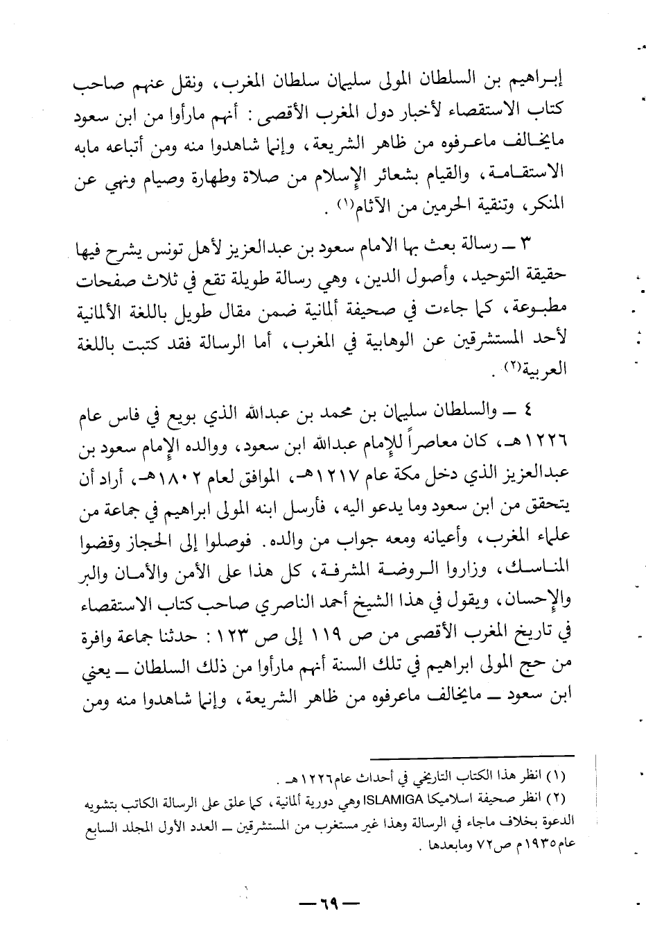 4) والسلطان سليمان بن محمد بن عبد الله الذي بويع في فاس عام 1226 هـ كان معاصراً للإمام عبد الله ابن سعود ووالده الإمام سعود بن عبد العزيز الذي دخل مكة عام 1217 هـ , الموافق لعام 1802 م أراد أن يتحقق من ابن سعود وما يدعوا إليه فأرسل ابنه المولى إبراهيم في جماعة من علماء المغرب وأعيانه ومعه جواب من والده فوصلوا إلى الحجاز وقضوا المناسك وزاروا الروضة الشريفة كل هذا على ألمن والأمان والبر والإحسان ويقول في هذا الشيخ أحمد الناصري صاحب كتاب الاستقصاء في تاريخ المغرب الأقصى من ص 119 إلى ص 123: حدثنا جماعة وافرة من حج المولى إبراهيم في تلك السنة أنهم ما رأوا من ذلك السلطان - يعني ابن سعود - ما يخالف ما عرفوه من ظاهر الشريعة وإنما شاهدوا منه ومن