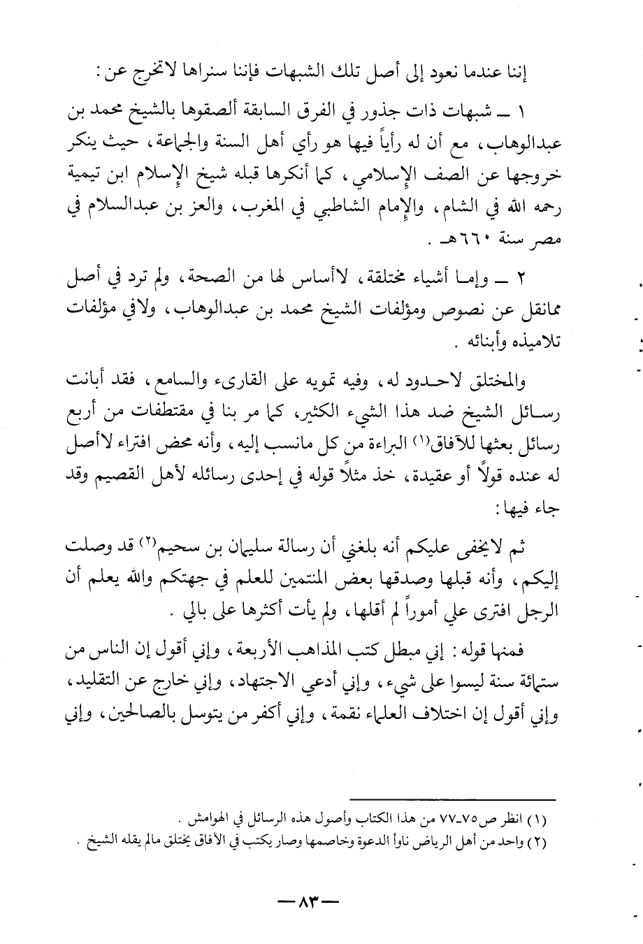 ثم لا يخفى عليكم أنه بلغني أن رسالة سليمان بن سحيم (¬2) قد وصلت إليكم وأنه قبلها وصدقها بعض المنتمين للعلم في جهتكم والله يعلم أن الرجل افترى على أموراً لم أقلها ولم يأت أكثرها على بالي.