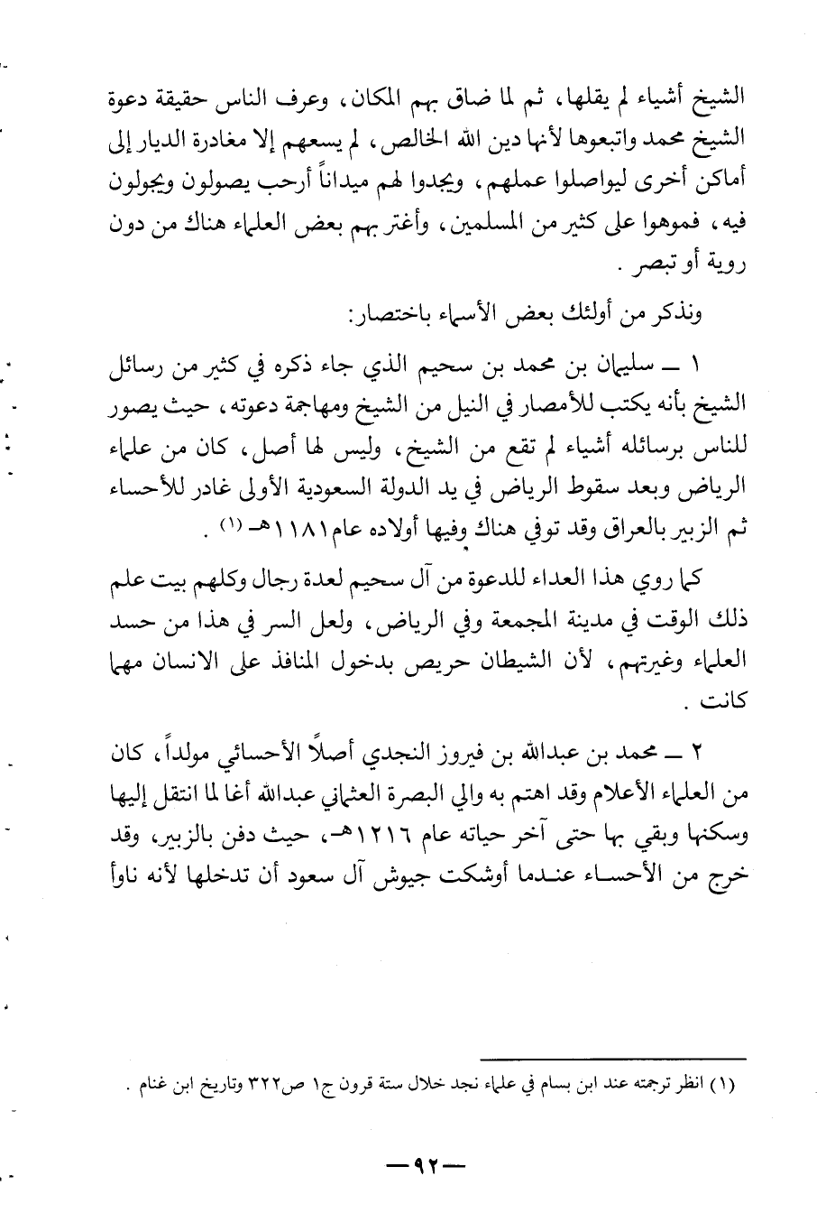 1- سليمان بن محمد بن سحيم الذي جاء ذكره في كثير من رسائل الشيخ بأنه يكتب للأمصار في النيل من الشيخ ومهاجمة دعوته حيث يصور للناس برسائله أشياء لم تقع من الشيخ وليس لها أصل , كان من علماء الرياض وبعد سقوط الرياض في يد الدولة السعودية الأولى غادر للأحساء ثم الزبير بالعراق وقد توفي هناك وفيها أولاده عام 1181 هـ (¬1) .