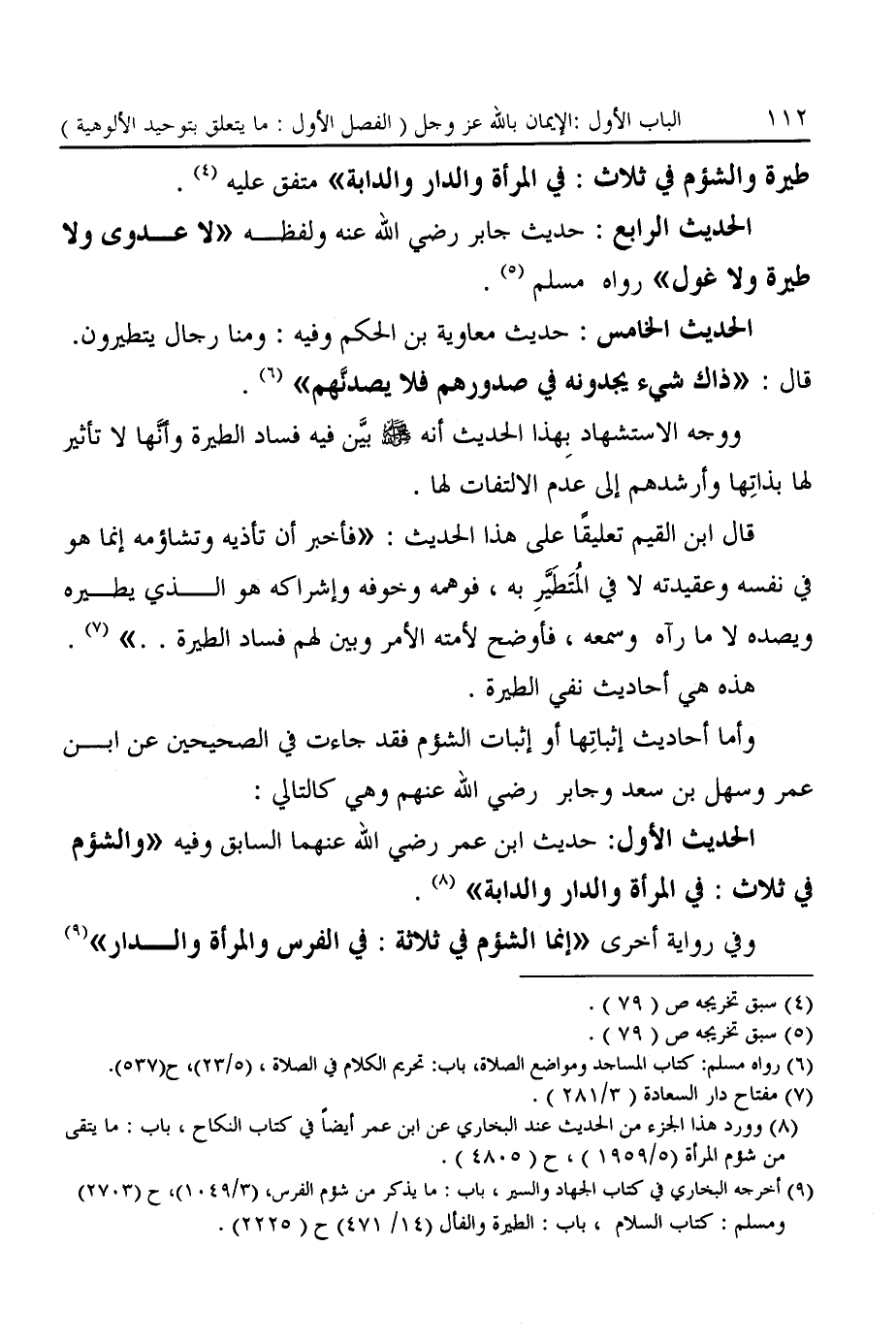 (¬٩) أخرحه البخاري في كتاب الجهاد والسير، باب: ما يذكر من شؤم الفرس، (٣/ ١٠٤٩)، ح (٢٧٠٣) ومسلم: كتاب السلام، باب: الطيرة والفأل (١٤/ ٤٧١) ح (٢٢٢٥).