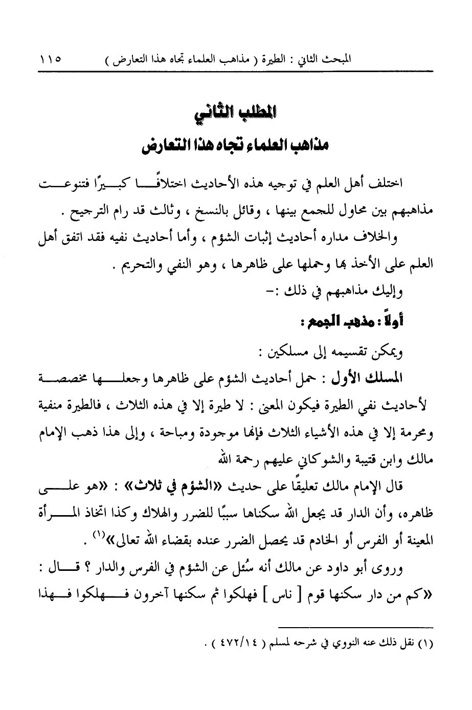 المسلك الأول: حمل أحاديث الشؤم على ظاهرها وجعلها مخصصة لأحاديث نفى الطيرة فيكون المعنى: لا طيرة إلا في هذه الثلاث، فالطيرة منفية ومحرمة إلا في هذه الأشياء الثلاث فإنها موجودة ومباحة، وإلى هذا ذهب الإمام مالك وابن قتيبة والشوكاني عليهم رحمة الله.