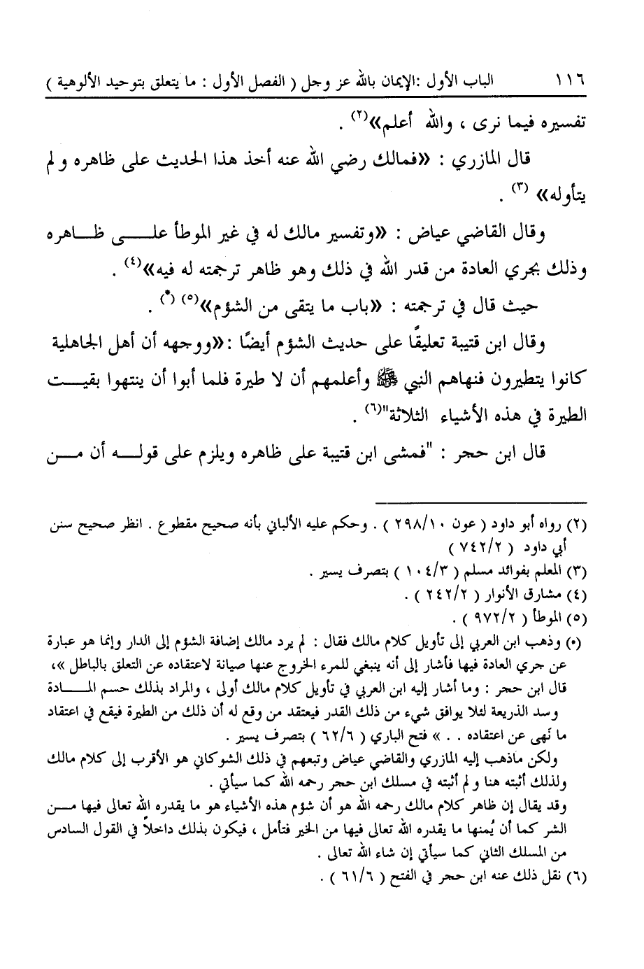(*) وذهب ابن العربى إلى تأويل كلام مالك فقال: لم يرد مالك إضافة الشؤم إلى الدار وإنما هو عبارة عن جرى العادة فيها فأشار إلى أنه ينبغى للمرء الخروج عنها صيانة لاعتقاده عن التعلق بالباطل"، قال ابن حجر: وما أشار إليه ابن العربي في تأويل كلام مالك أولى، والمراد بذلك حسم المادة وسد الذريعة لئلا يوافق شىء من ذلك القدر فيعتقد من وقع له أن ذلك من الطيرة فيقع في اعتقاد ما نَهى عن اعتقاده .. " فتح البارى (٦/ ٦٢) بتصرف يسير.