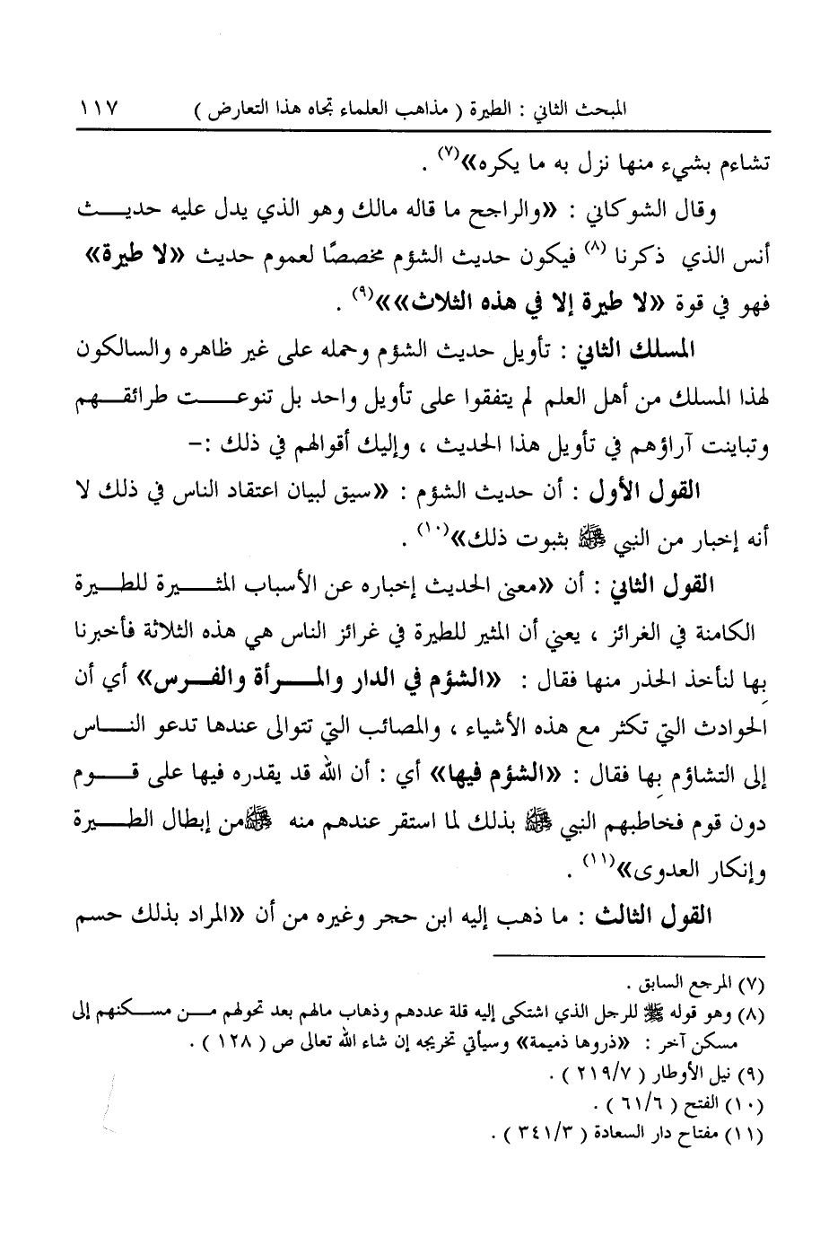 وقال الشوكاني: "والراجح ما قاله مالك وهو الذي يدل عليه حديث أنس الذي ذكرنا (¬٨) فيكون حديث الشؤم مخصصًا لعموم حديث "لا طيرة" فهو في قوة "لا طيرة إلا في هذه الثلاث"" (¬٩).