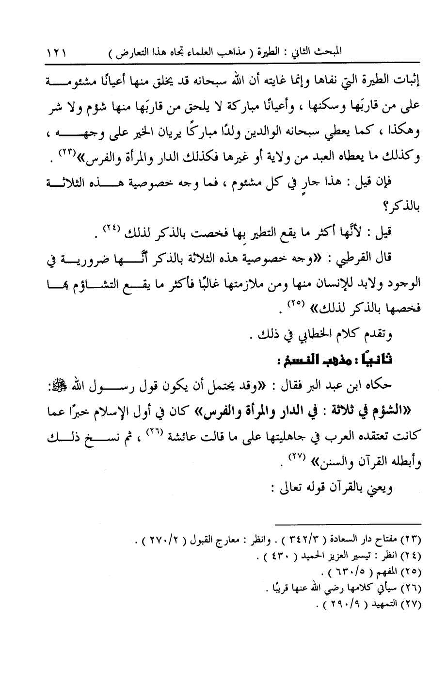 حكاه ابن عبد البر فقال: "وقد يحتمل أن يكون قول رسول الله -صَلَّى اللهُ عَلَيْهِ وَسَلَّمَ-: "الشؤم في ثلاثة: في الدار والمرأة والفرس" كان في أول الإسلام خبرًا عما كانت تعتقده العرب في جاهليتها على ما قالت عائشة (¬٢٦)، ثم نسخ ذلك وأبطله القرآن والسنن" (¬٢٧).