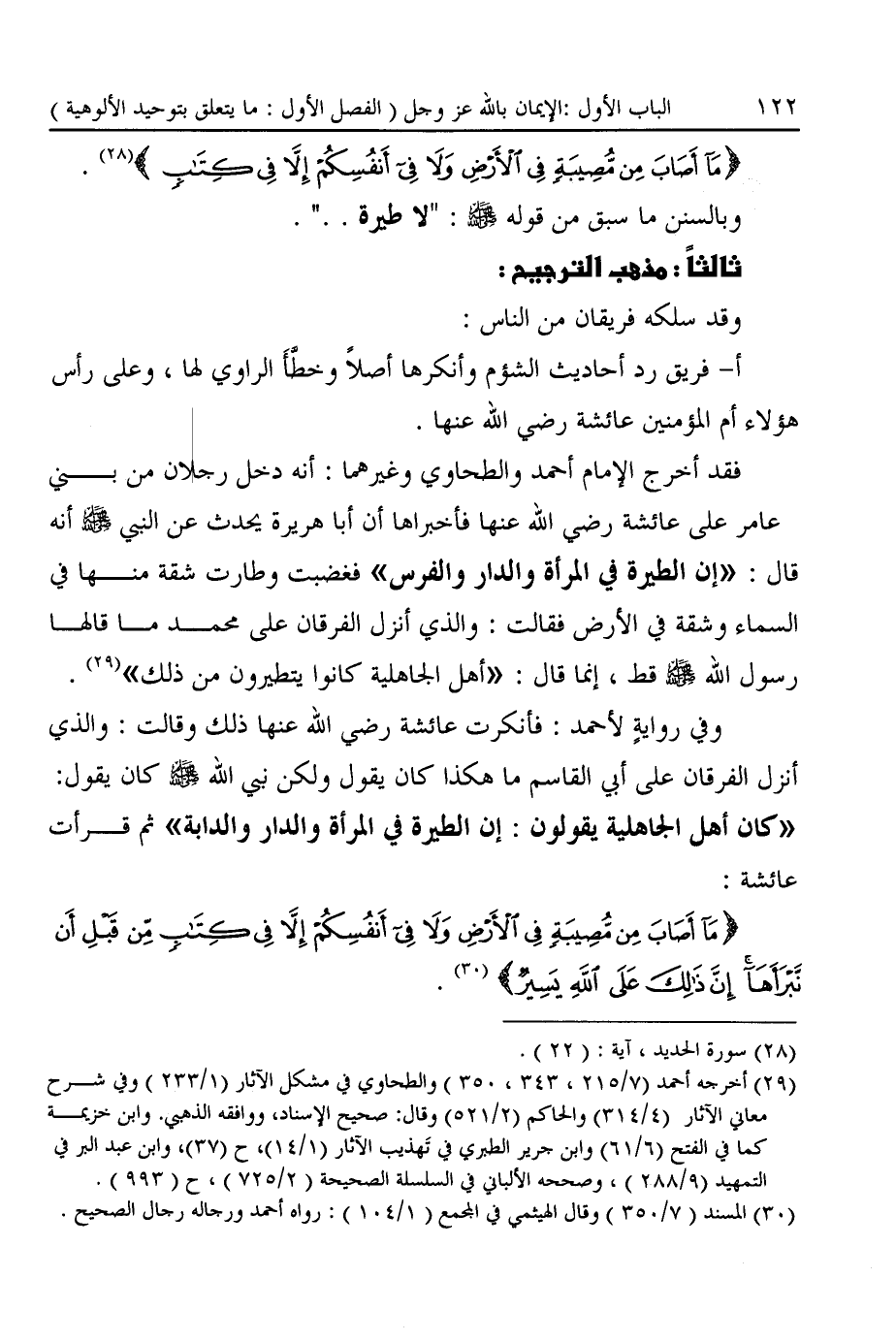 فقد أخرج الإمام أحمد والطحاوي وغيرهما: أنه دخل رجلان من بني عامر على عائشة رضى الله عنها فأخبراها أن أبا هريرة يحدث عن النبي -صَلَّى اللهُ عَلَيْهِ وَسَلَّمَ- أنه قال: "إن الطيرة في المرأة والدار والفرس" فغضبت وطارت شقة منها في السماء وشقة في الأرض فقالت: والذي أنزل الفرقان على محمد ما قالها رسول الله -صَلَّى اللهُ عَلَيْهِ وَسَلَّمَ- قط، إنما قال: "أهل الجاهلية كانوا يتطيرون من ذلك" (¬٢٩).
