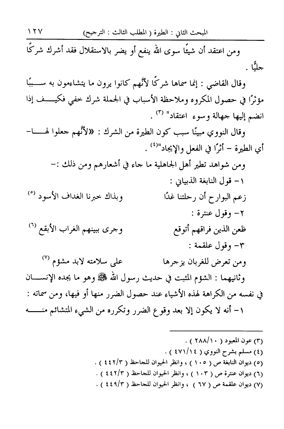 وقال القاضى: إنما سماها شركًا لأنَّهم كانوا يرون ما يتشاءمون به سببًا مؤثرًا في حصول المكروه وملاحظة الأسباب في الجملة شرك خفى فكيف إذا انضم إليها جهالة وسوء اعتقاد" (¬٣).