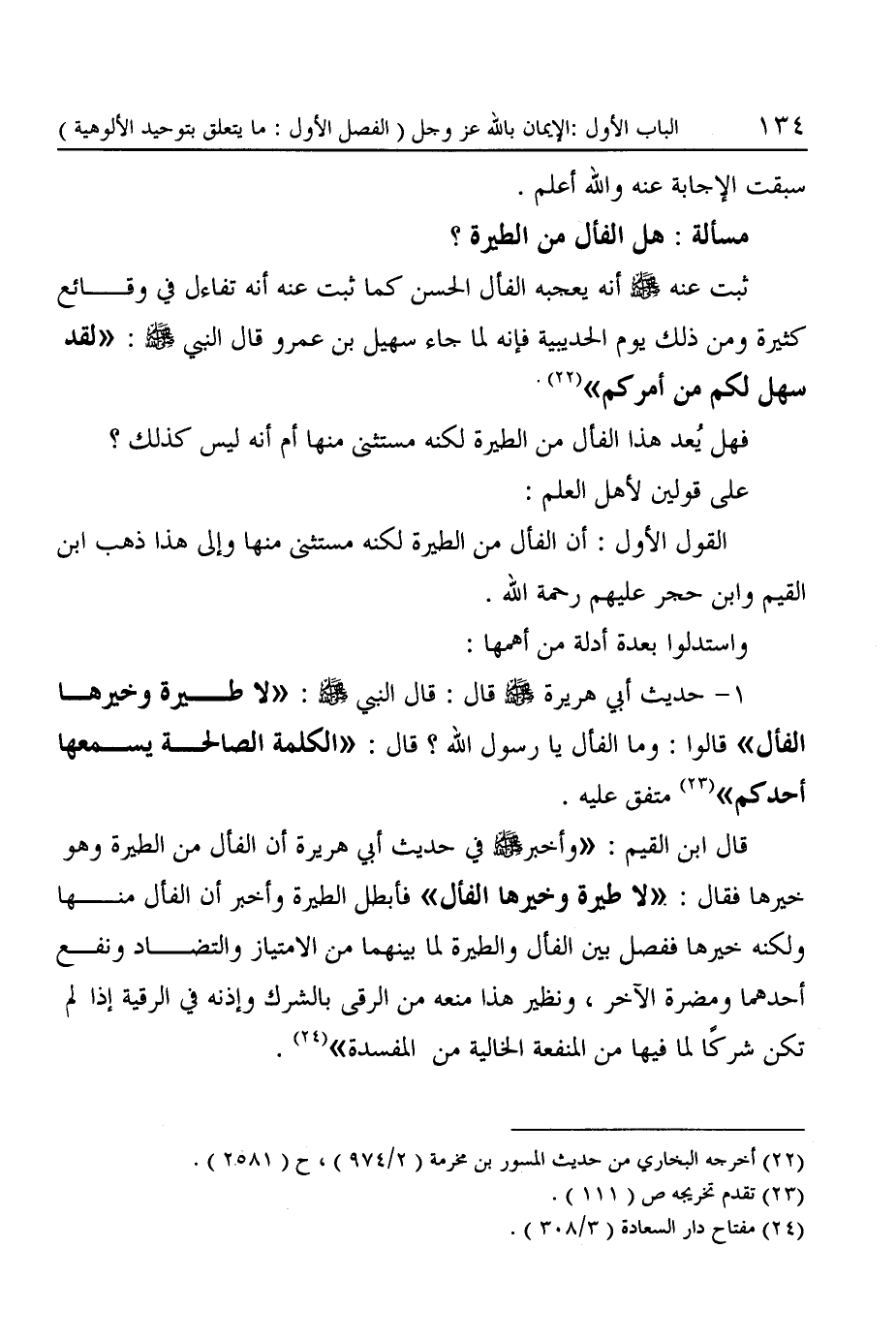 ١ - حديث أبي هريرة -رضي الله عنه- قال: قال النبي -صَلَّى اللهُ عَلَيْهِ وَسَلَّمَ-: "لا طيرة وخيرها الفأل" قالوا: وما الفأل يا رسول الله؟ قال: "الكلمة الصالحة يسمعها أحدكم" (¬٢٣) متفق عليه.