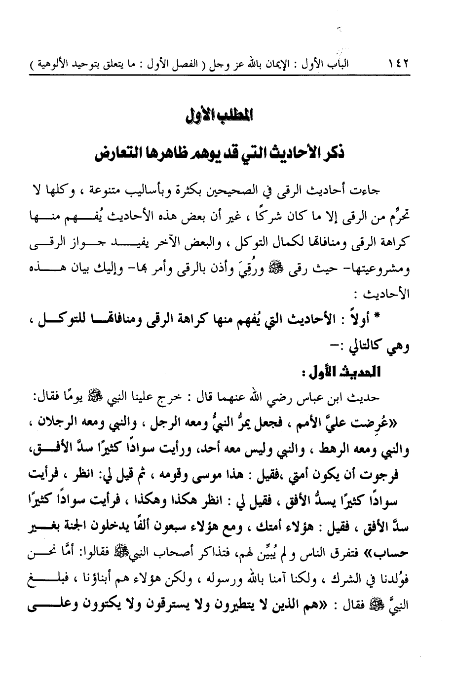 حديث ابن عباس رضى الله عنهما قال: خرج علينا النبي -صَلَّى اللهُ عَلَيْهِ وَسَلَّمَ- يومًا فقال: "عُرِضت عليَّ الأمم، فجعل يمرُّ النبيُّ ومعه الرجل، والنبي ومعه الرجلان، والنبي ومعه الرهط، والنبي وليس معه أحد، ورأيت سوادًا كثيرًا سدَّ الأفق، فرجوت أن يكون أمتي، فقيل: هذا موسى وقومه، ثم قيل لي: انظر، فرأيت سوادًا كثيرًا يسدُّ الأفق، فقيل لي: انظر هكذا وهكذا، فرأيت سوادًا كثيرًا سدَّ الأفق، فقيل: هؤلاء أمتك، ومع هؤلاء سبعون ألفًا يدخلون الجنة بغير حساب" فتفرق الناس ولم يُبيِّن لهم، فتذاكر أصحاب النبي -صَلَّى اللهُ عَلَيْهِ وَسَلَّمَ- فقالوا: أمَّا نحن فوُلدنا في الشرك، ولكنا آمنا بالله ورسوله، ولكن هؤلاء هم أبناؤنا، فبلغ النبيَّ -صَلَّى اللهُ عَلَيْهِ وَسَلَّمَ- فقال: "هم الذين لا يتطيرون ولا يسترقون ولا يكتوون وعلى