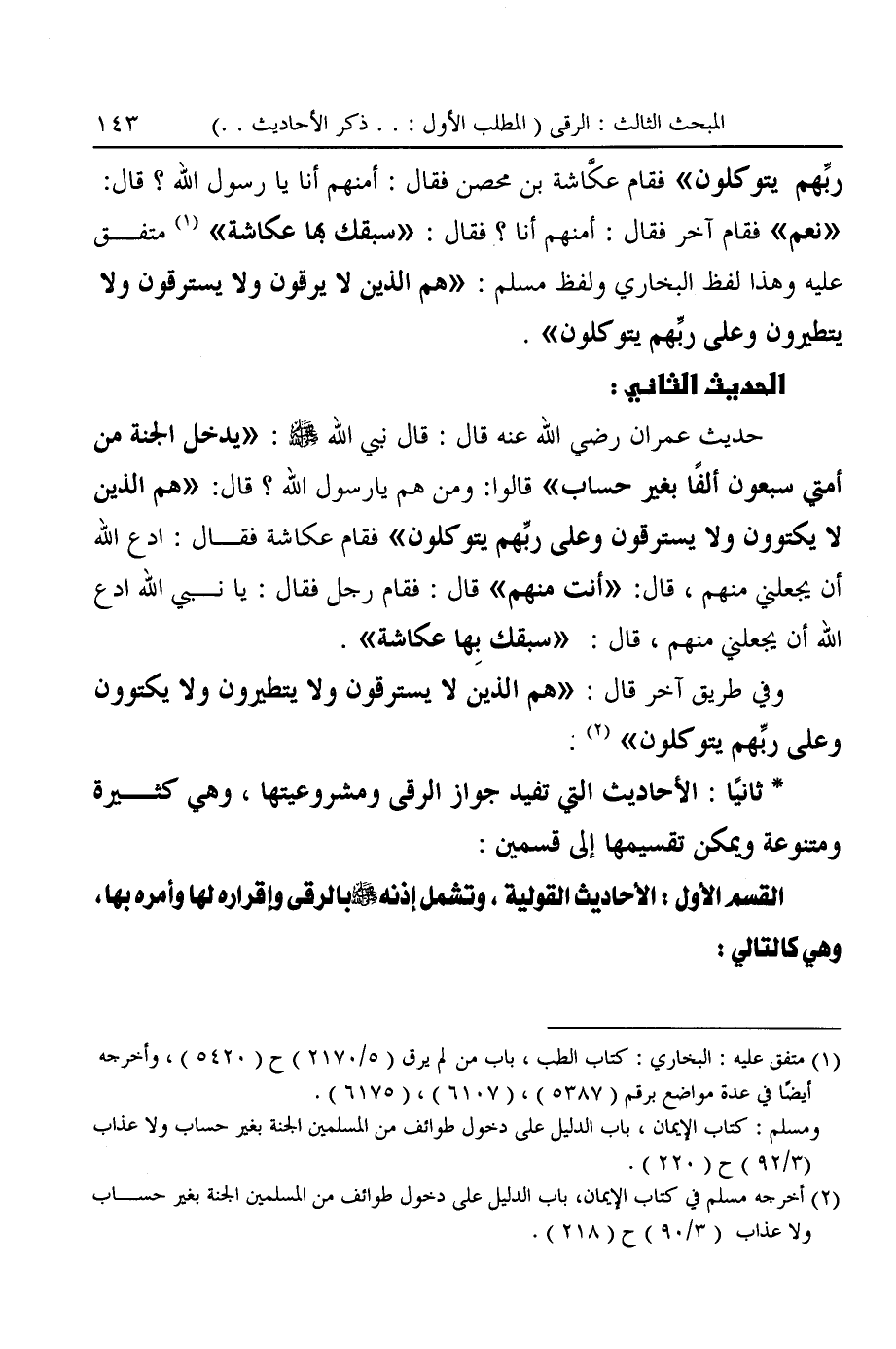 حديث عمران رضى الله عنه قال: قال نبي الله -صَلَّى اللهُ عَلَيْهِ وَسَلَّمَ-: "يدخل الجنة من أمتي سبعون ألفًا بغير حساب" قالوا: ومن هم يا رسول الله؟ قال: "هم الذين لا يكتوون ولا يسترقون وعلى ربِّهم يتوكلون" فقام عكاشة فقال: ادع الله أن يجعلني منهم، قال: "أنت منهم" قال: فقام رجل فقال: يا نبي الله ادع الله أن يجعلني منهم، قال: "سبقك بِها عكاشة".