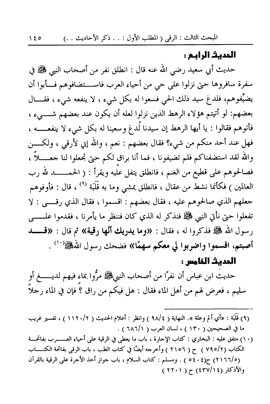 (¬١٠) متفق عليه: البخاري: كتاب الإجارة، باب ما يعطى في الرقية على أحياء العرب بفاتحة الكتاب (٢/ ٧٩٥) ح (٢١٥٦) وأخرجه أيضًا في كتاب الطب، باب الرقى بفاتحة الكتاب (٥/ ٢١٦٦) ح (٥٤٠٤). ومسلم: كتاب السلام، باب جواز أخذ الأجرة على الرقية بالقرآن والأذكار (١٤/ ٤٣٧) ح (٢٢٠١)