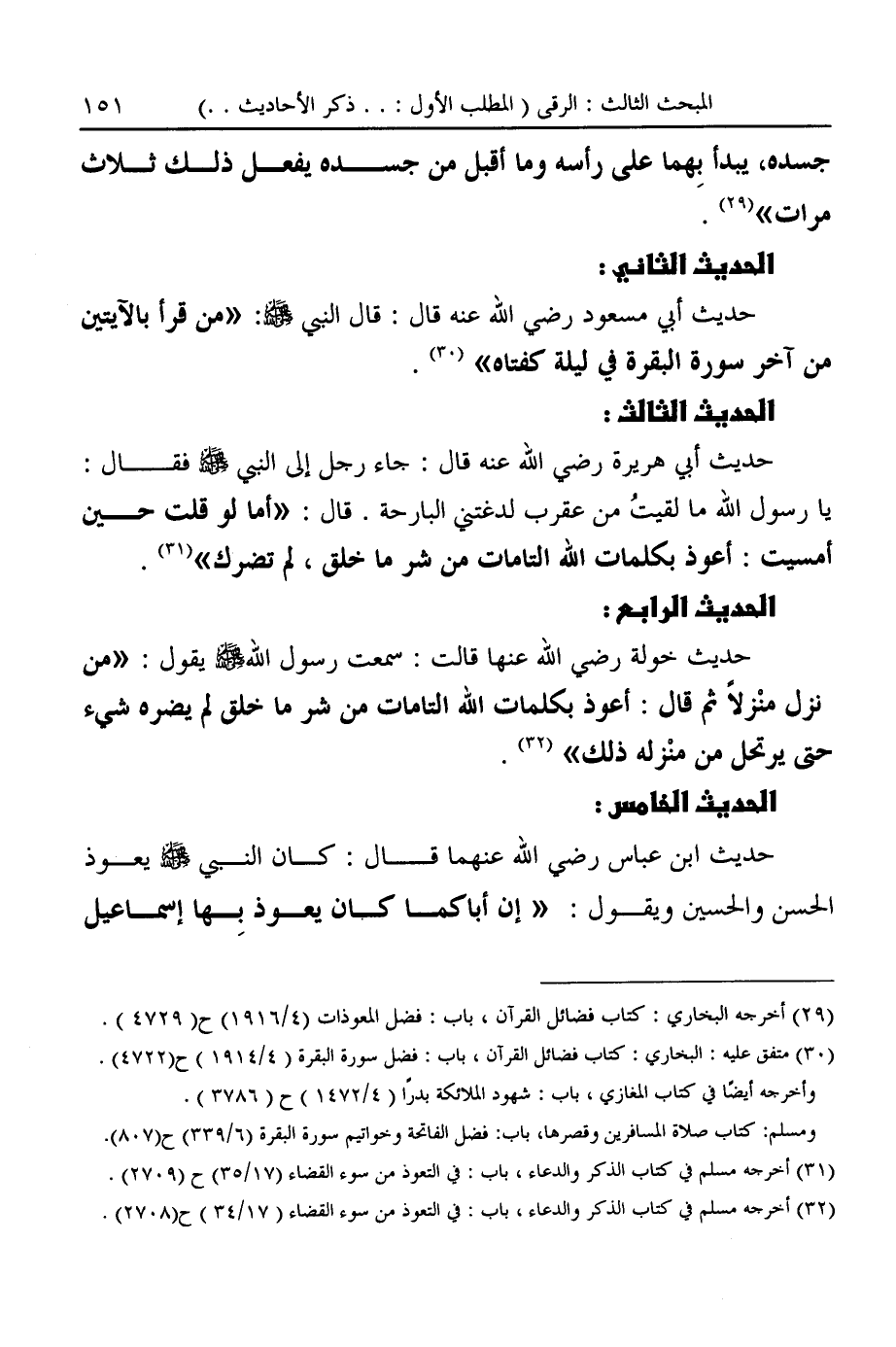 حديث خولة رضى الله عنها قالت: سمعت رسول الله -صَلَّى اللهُ عَلَيْهِ وَسَلَّمَ- يقول: "من نزل منْزلًا ثم قال: أعوذ بكلمات الله التامات من شر ما خلق لم يضره شيء حتى يرتحل من منْزله ذلك" (¬٣٢).