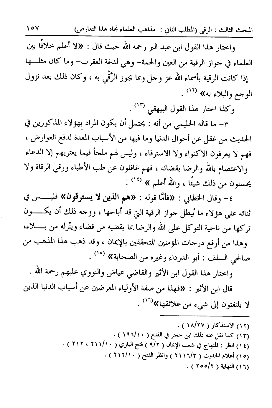 واختار هذا القول ابن عبد البر رحمه الله حيث قال: "لا أعلم خلافًا بين العلماء في جواز الرقية من العين والحمة -وهي لدغة العقرب- وما كان مثلها إذا كانت الرقية بأسماء الله عز وجل وبما يجوز الرَّقْي به، وكان ذلك بعد نزول الوجع والبلاء به" (¬١٢).