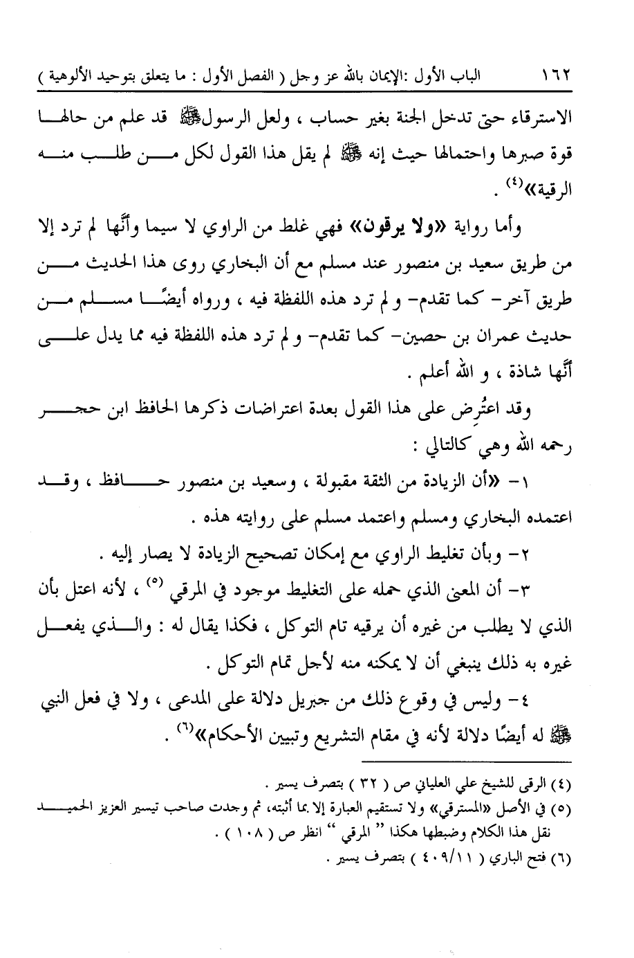 وأما رواية "ولا يرقون" فهى غلط من الراوي لا سيما وأنَّها لم ترد إلا من طريق سعيد بن منصور عند مسلم مع أن البخاري روى هذا الحديث من طريق آخر -كما تقدم- ولم ترد هذه اللفظة فيه، ورواه أيضًا مسلم من حديث عمران بن حصين -كما تقدم- ولم ترد هذه اللفظة فيه مما يدل على أَنها شاذة، والله أعلم.