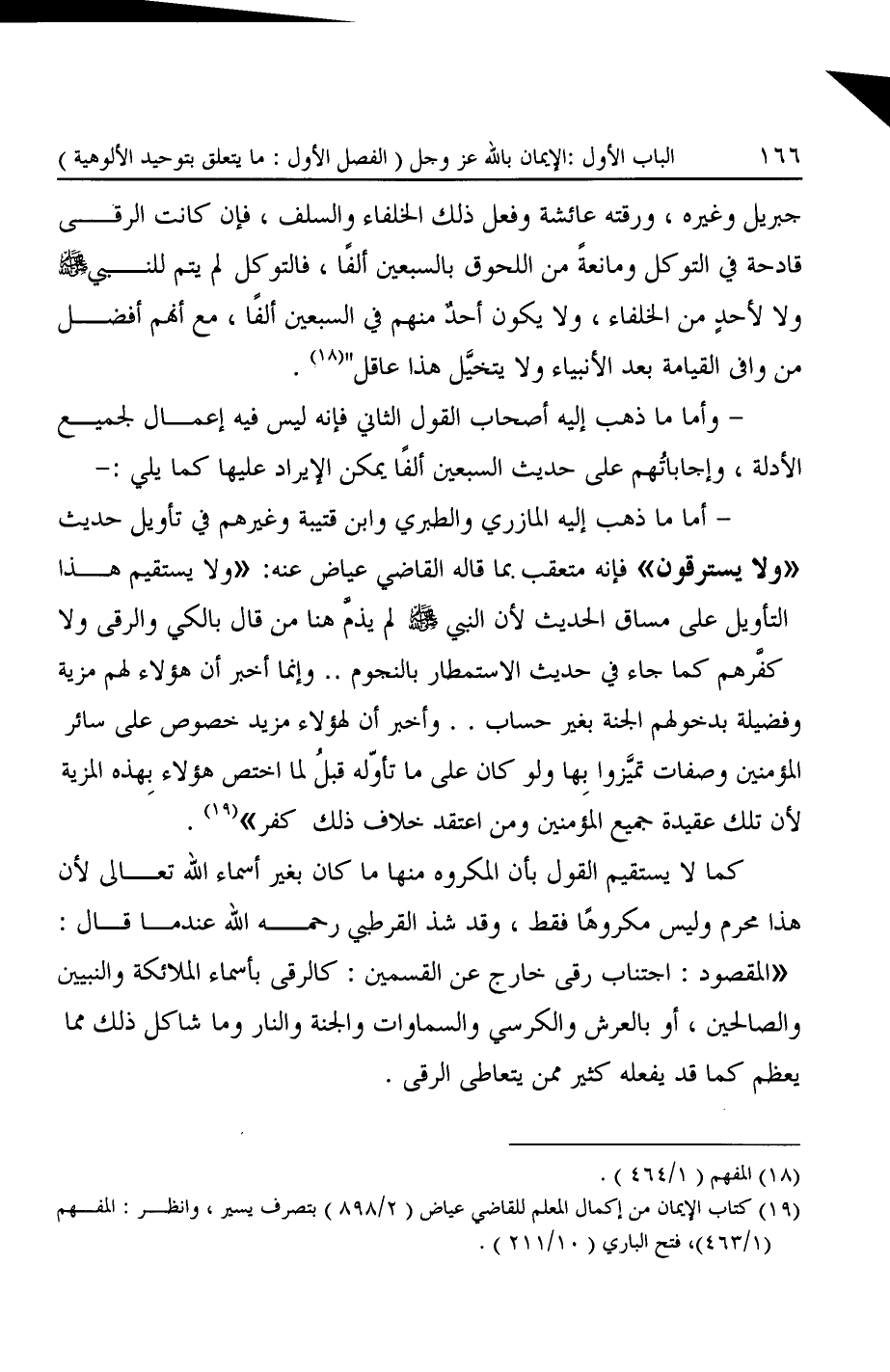 - أما ما ذهب إليه المازري والطبري وابن قتيبة وغيرهم في تأويل حديث "ولا يسترقون" فإنه متعقب بما قاله القاضى عياض عنه: "ولا يستقيم هذا التأويل على مساق الحديث لأن النبي -صَلَّى اللهُ عَلَيْهِ وَسَلَّمَ- لم يذمّ هنا من قال بالكى والرقى ولا كفرهم كما جاء في حديث الاستمطار بالنجوم .. وإنما أخبر أن هؤلاء لهم مزية وفضيلة بدخولهم الجنة بغير حساب .. وأخبر أن لهؤلاء مزيد خصوص على سائر المؤمنين وصفات تميَّزوا بِها ولو كان على ما تأوّله قبلُ لما اختص هؤلاء بِهذه المزية لأن تلك عقيدة جميع المؤمنين ومن اعتقد خلاف ذلك كفر" (¬١٩).