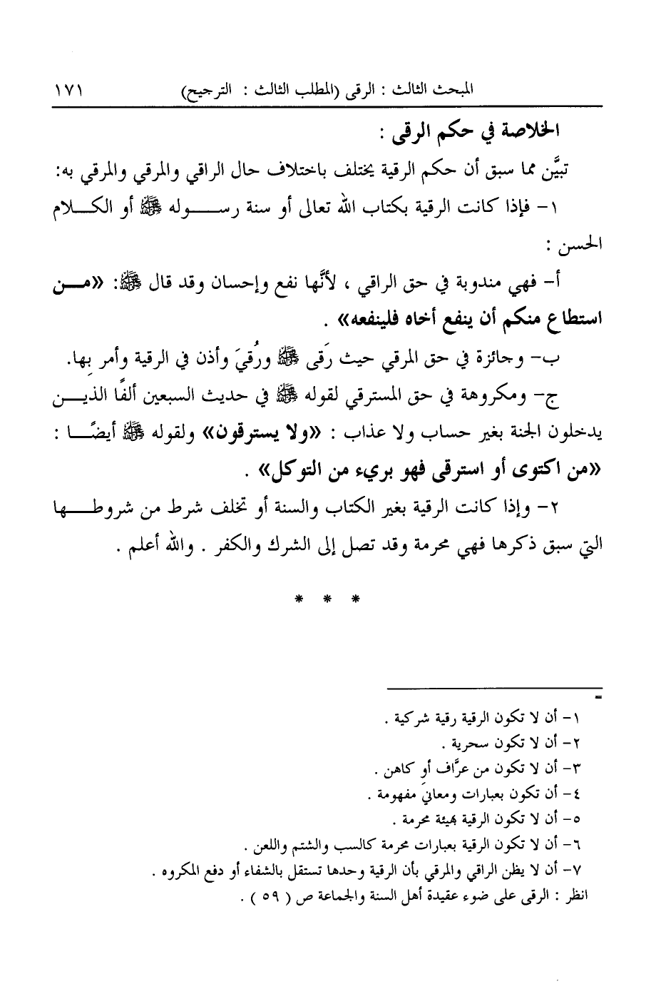 ٧ - أن لا يظن الراقى والمرقى بأن الرقية وحدها تستقل بالشفاء أو دفع المكروه. انظر: الرقى على ضوء عقيدة أهل السنة والجماعة ص (٥٩).